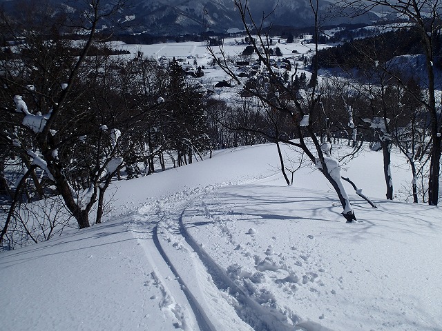 激パウとはいきませんが、ヘルベントスキーが一番威力を発揮してくれる雪の状態でした。気持ちよくカービングで滑降することができます。適度に斜度があり、疎林ときています。思わずスピードが出てしまいました。一番ボトムまで行ってしまうと帰りが大変です。適度なところでトラバースをかけ、ハイクしてきた尾根を目指します。このトラバースも疎林の中なので、10分ほどでハイクをスタートした尾根に着くことができました。