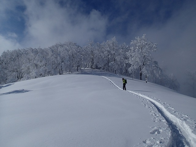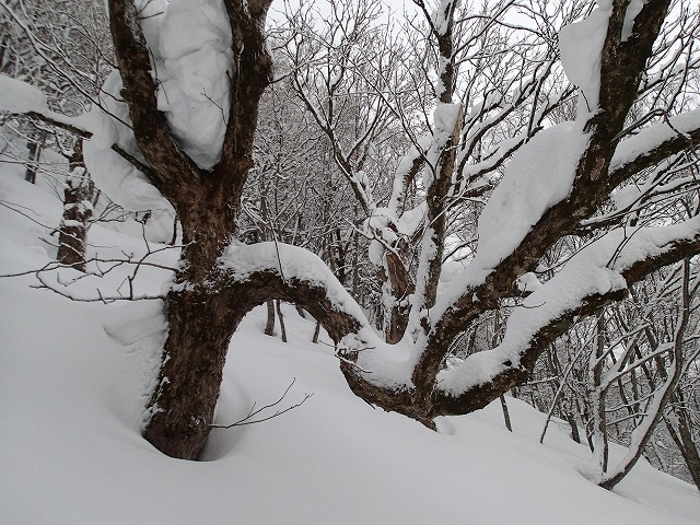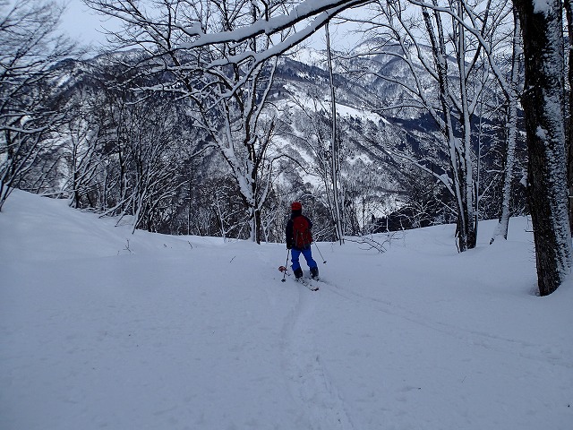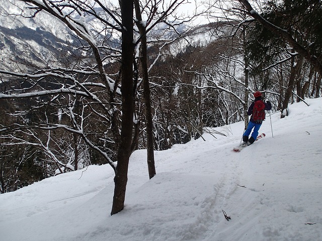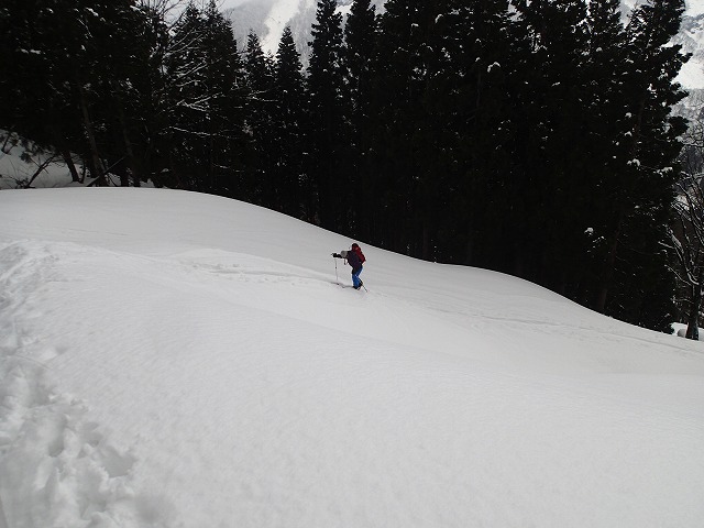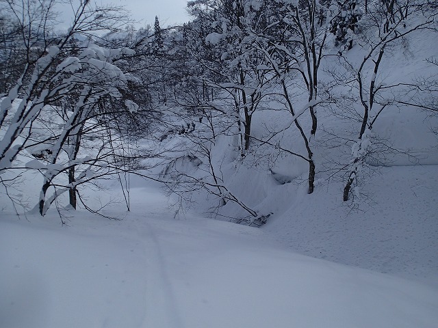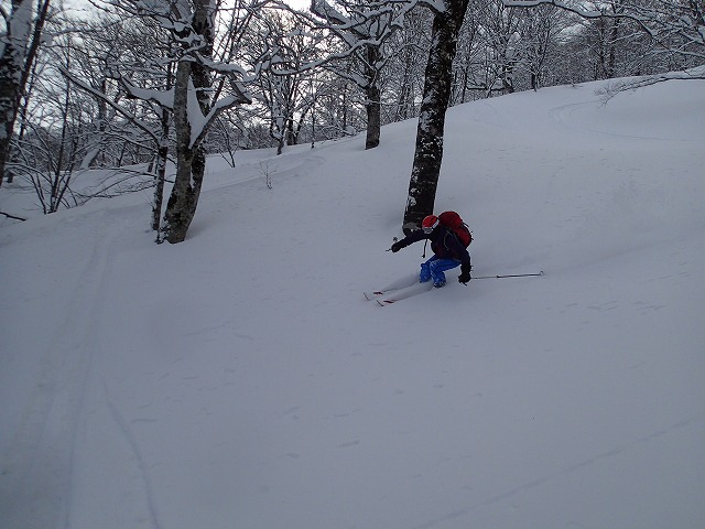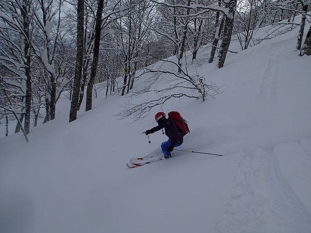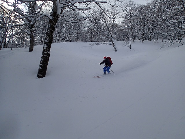 左・左と滑降を行い、前回苦労させられた2本の沢もさらりとクリアー。やはりこの山は1月に入ってからのほうがいいようです。