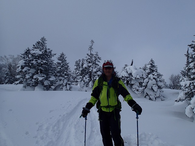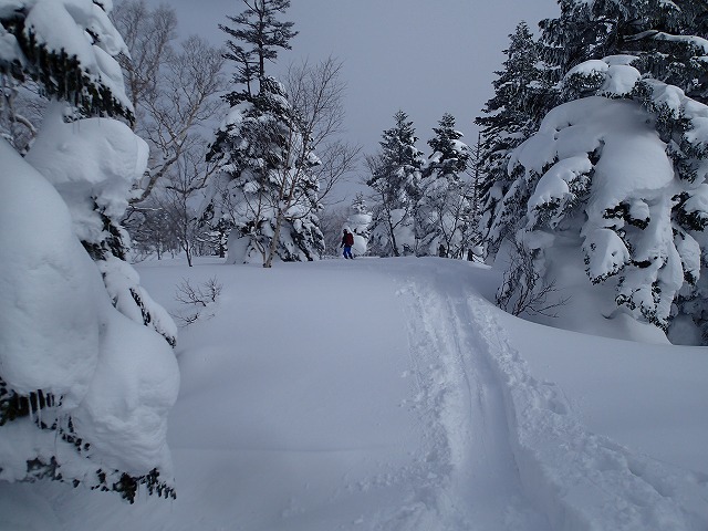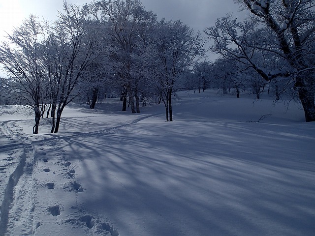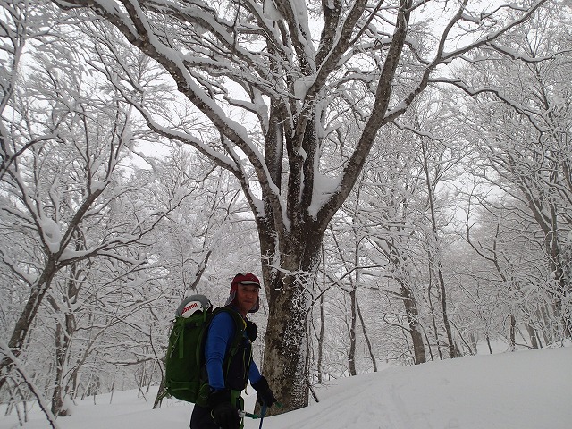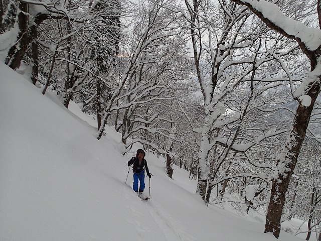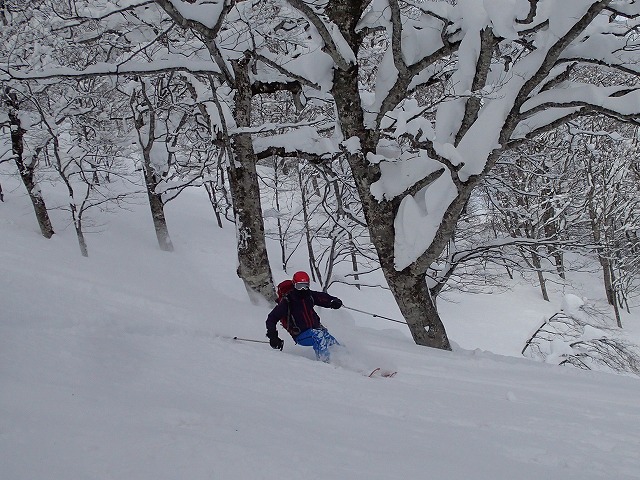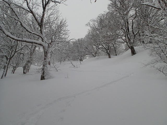 新雪が降ったばかりであれば、このあたりも充分に滑降を楽しむことができる斜面です。今回は雪が重く苦労させらえました。