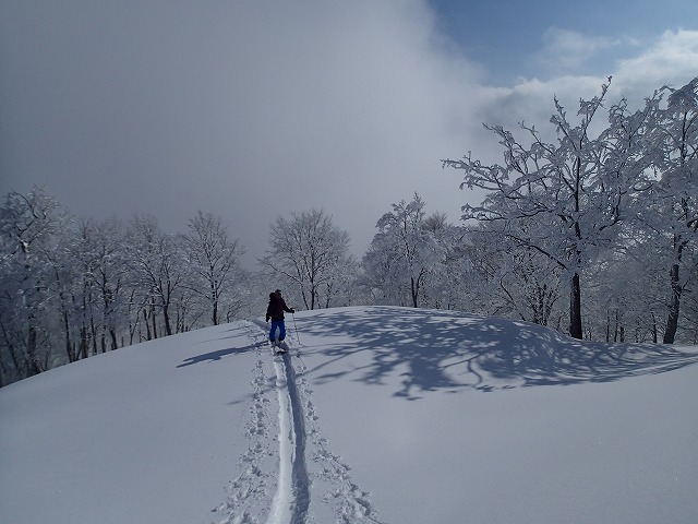 先週の「鍋倉山」はハイク時間は少ないため、滑降距離も短いのですが、今回は山頂からの帰路のほとんどが滑降となります。細尾根を降りてくるのとは違い、広々とした樹林帯を滑降する楽しさがここにはありました。