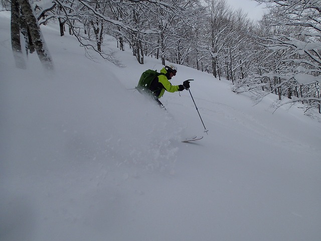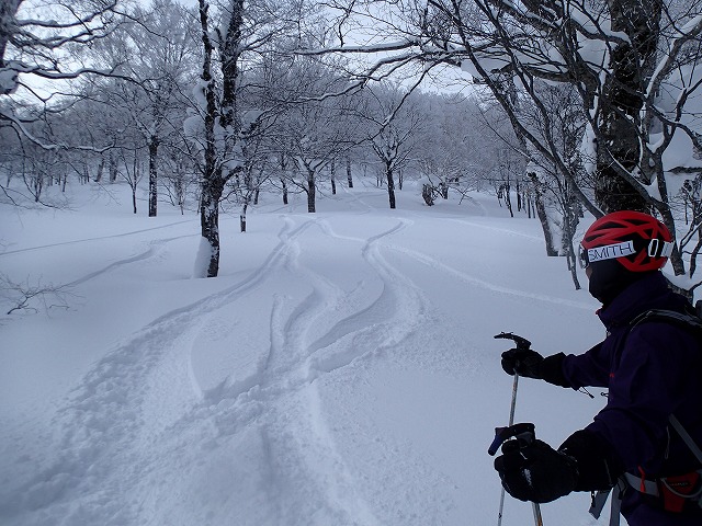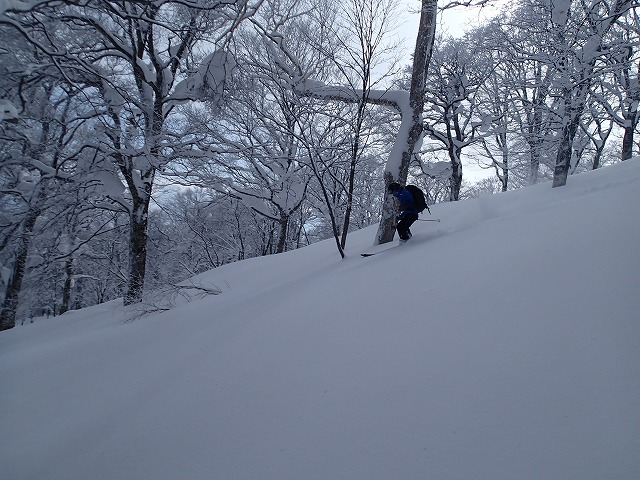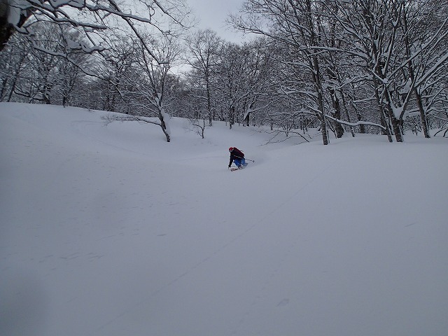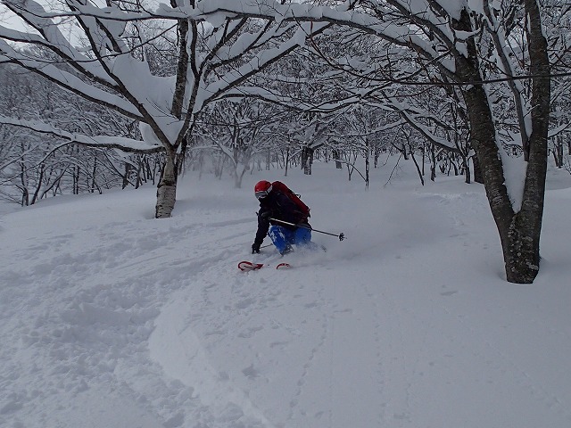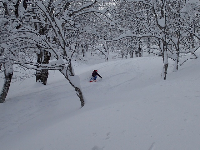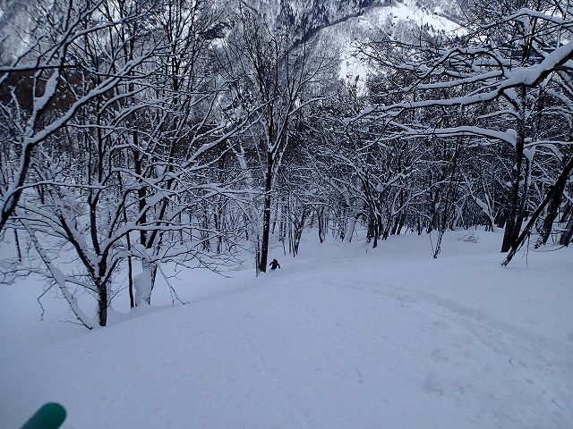 鞍部からが本番です。ここもいい感じでパウダーを味わうことができましたが、標高が下がるにつれ雪も重くなってきます。