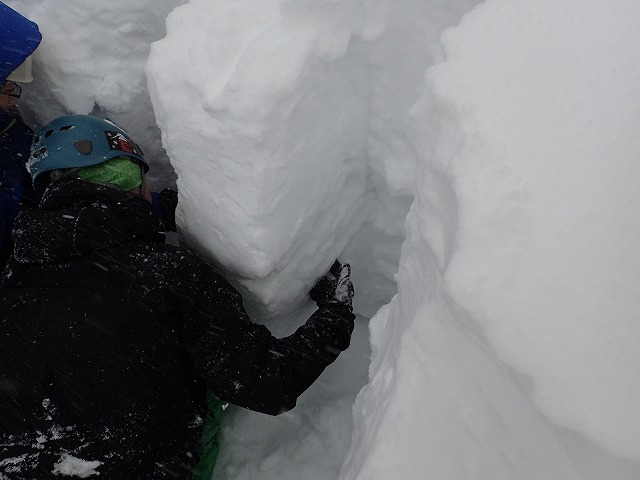 表層10cmはすぐに崩れますが、その下1mほどのところで雪柱が崩れました。ただ、相当上からの圧力をかけた状態だったので、納得してハイクを進めます。