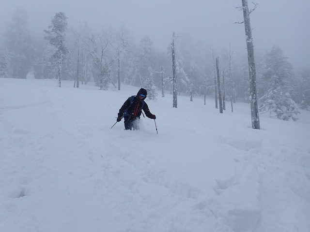 新雪は、どんどん深くなってきます。吹き溜まりに来ると、腰までの新雪です。先頭を交代しながら進んでいきました。