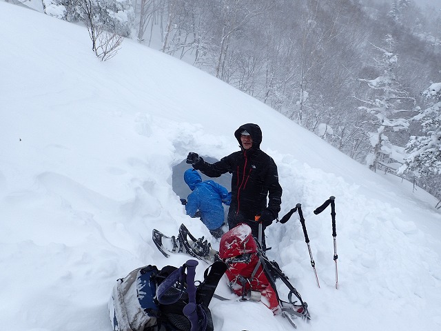 途中 雪洞を掘っている方を発見。声をかけます。中でラーメンを食べるそうです。