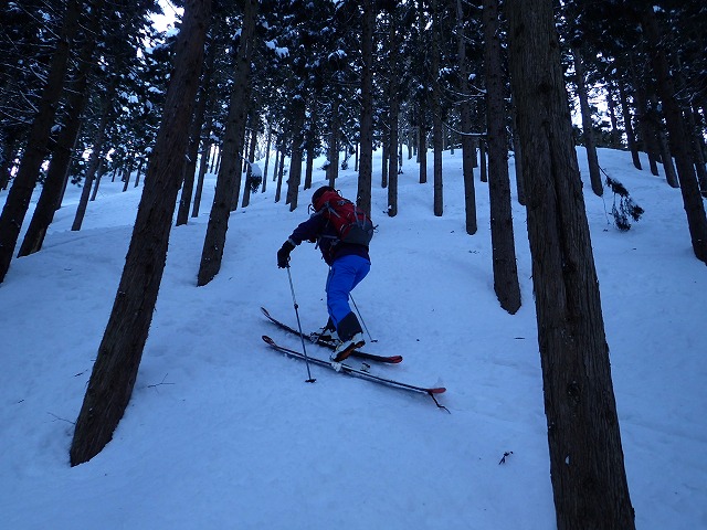 今回は、林道が大きくカーブしているところから杉林にスムーズに上がることができました。(昨年はこの取り付きでもたつきました。)杉林の中は急登となります。いつものように天狗蔵君が先頭になってトレースに沿ってハイクしていきます。これがハイペースなのです。(寝不足の身体にこたえます。)
