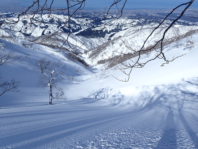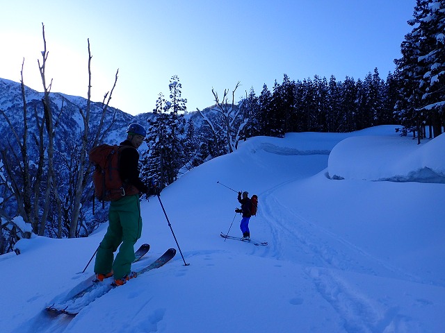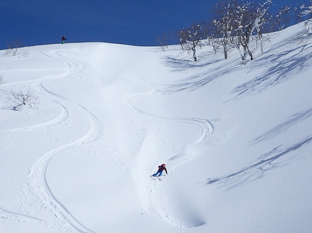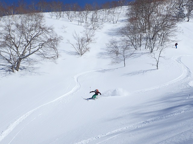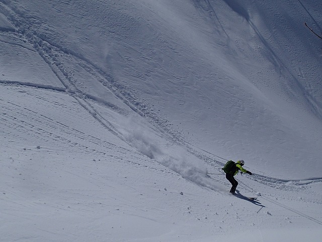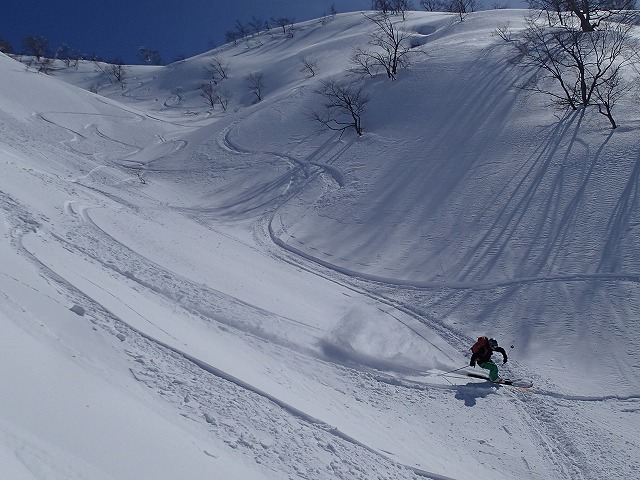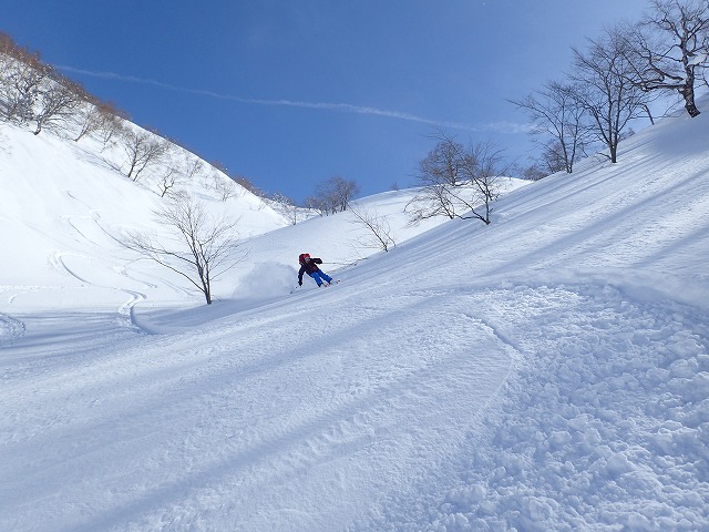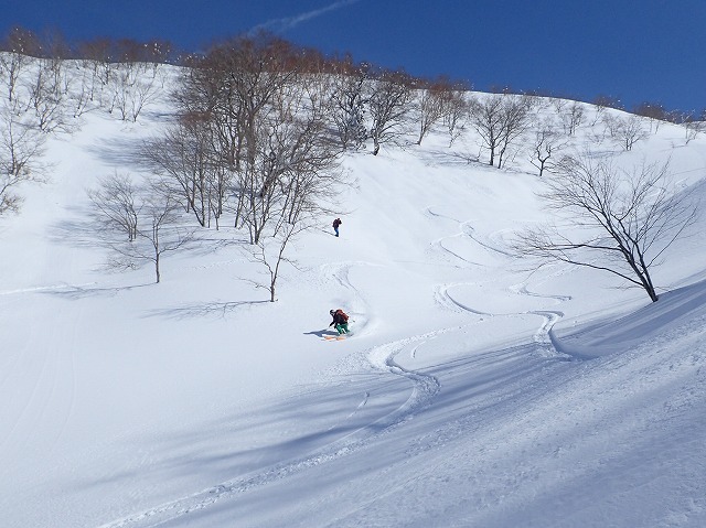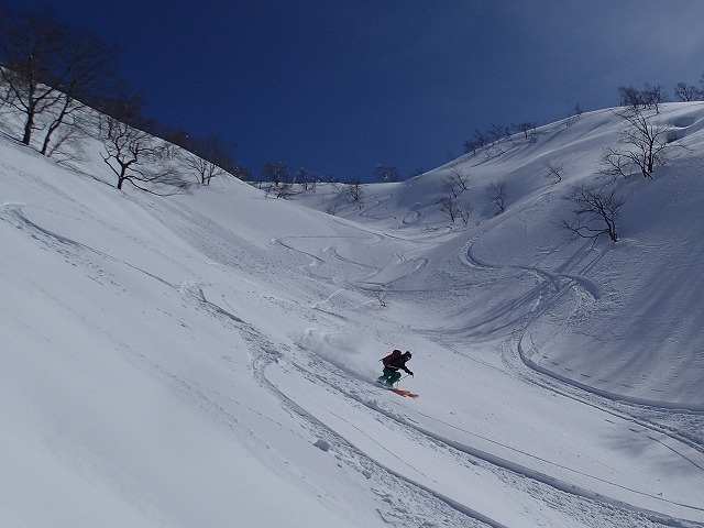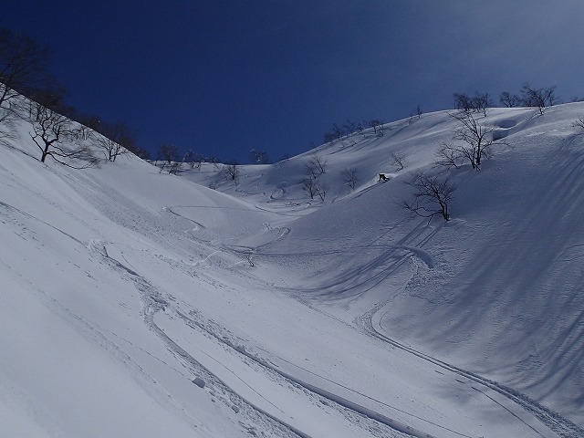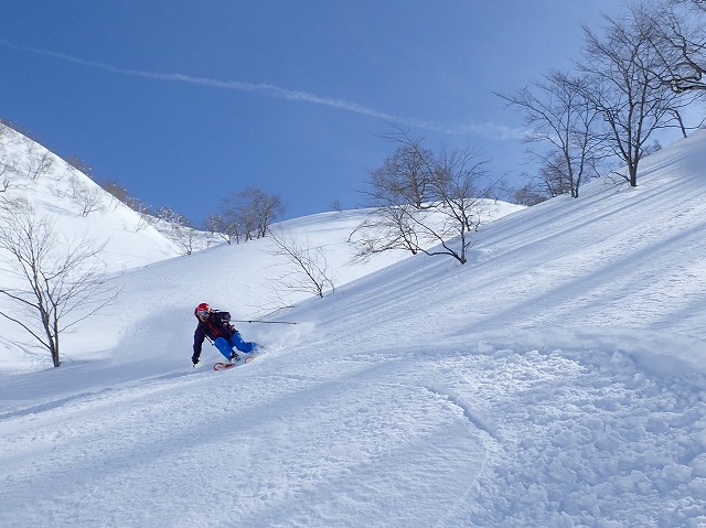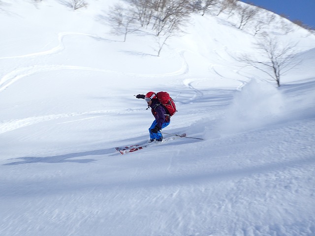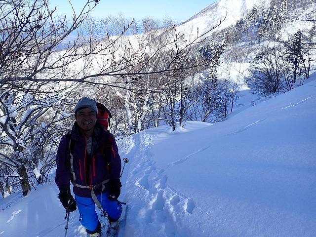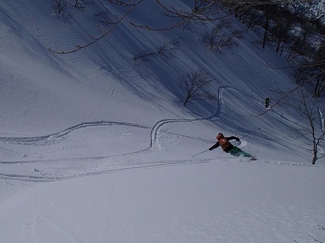 途中、かんじきでハイクしてくる幸ちゃんにご挨拶し、成谷山下の谷を目指します。この谷は昨年も滑っています。斜度的にも雪崩れる心配は薄いようです。12:37写真を撮り合いながらあっという間にトレースに合流です。今回も14分間のパウダー滑降でした。