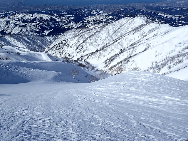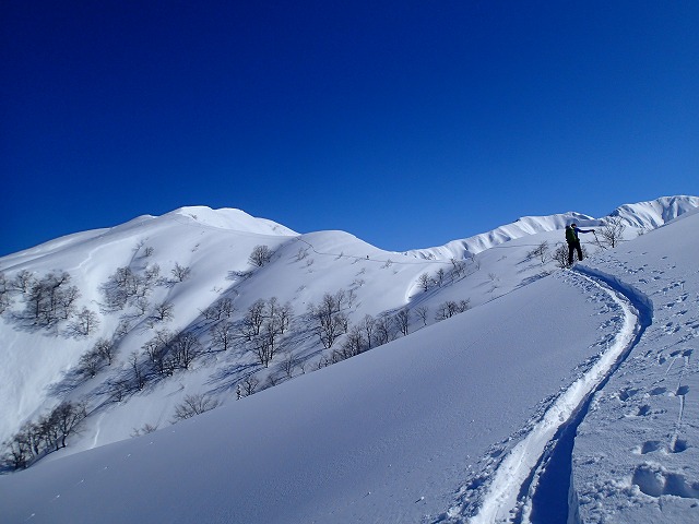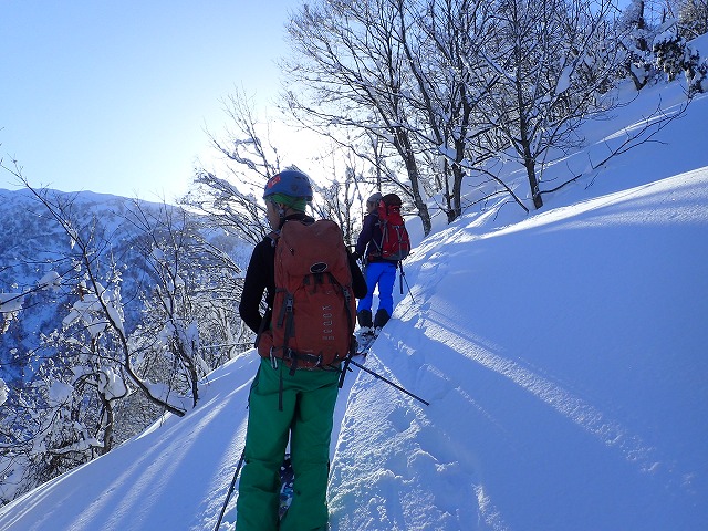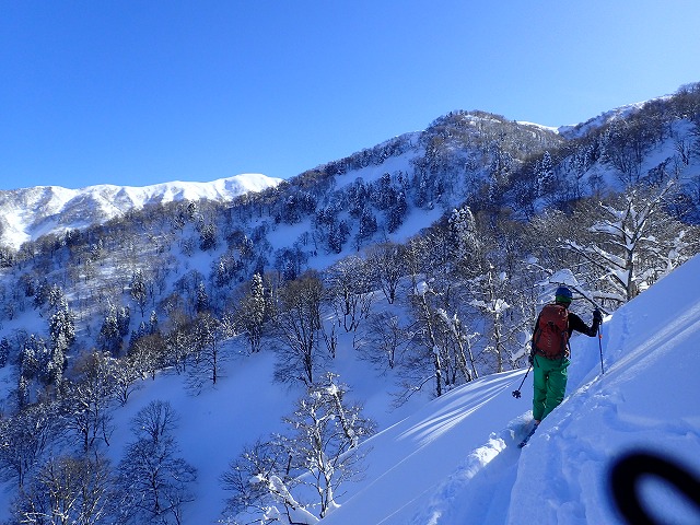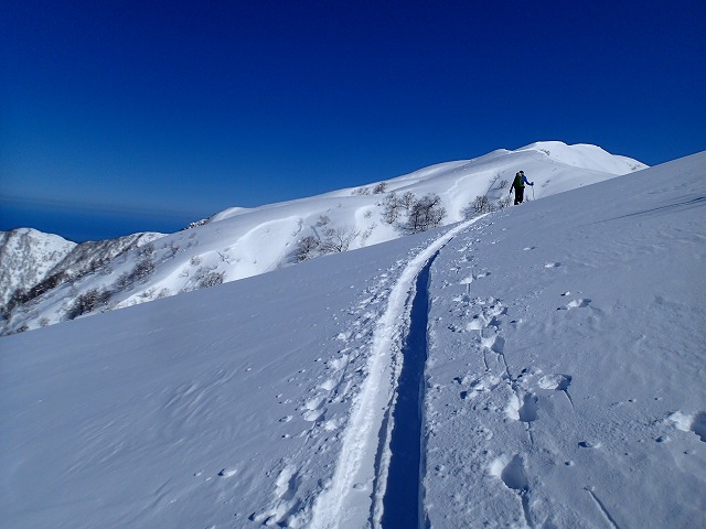 ここも右の斜面から左の斜面にうまく回り込み絶妙なトレースが付いています。先頭は相当ベテランの方とお見受けしました。
