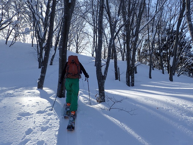その後、再び林の中に入っていき、尾根沿いにハイクしていきます。スキーのトレースとかんじきのトレースの2本があるのですが、やはりスキーのトレースが楽なのでそちらを使います。