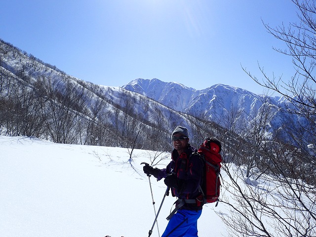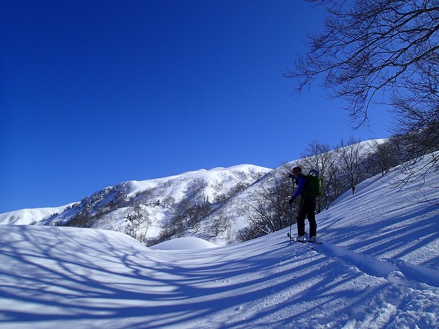 9:46 本日滑降予定の谷が見えてきました。ここで上の急斜面を見上げると4名のかんじきの登山者がいます。あっという間に追いついてしまいました。ご挨拶しながら前を見ると天狗蔵君が、