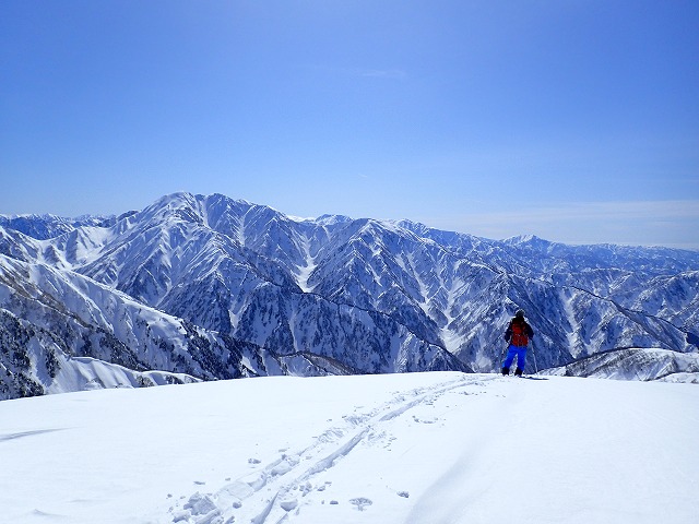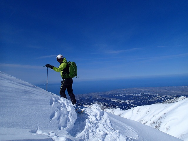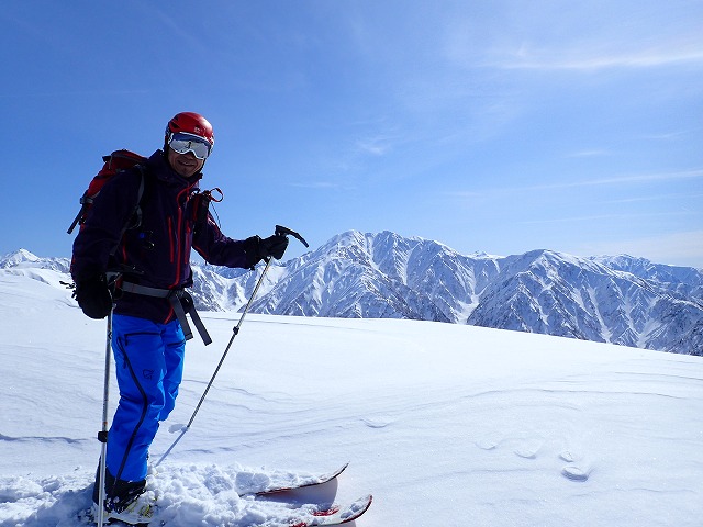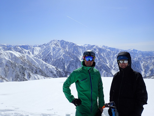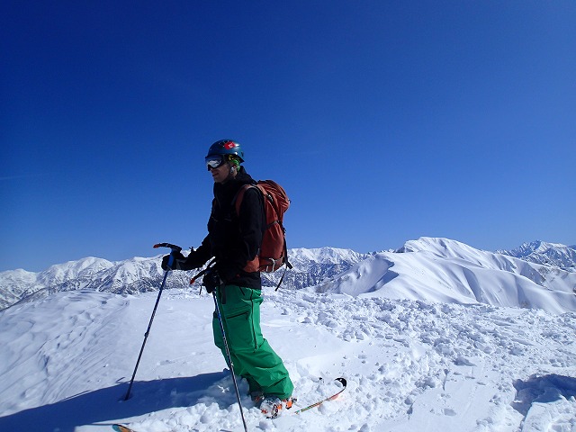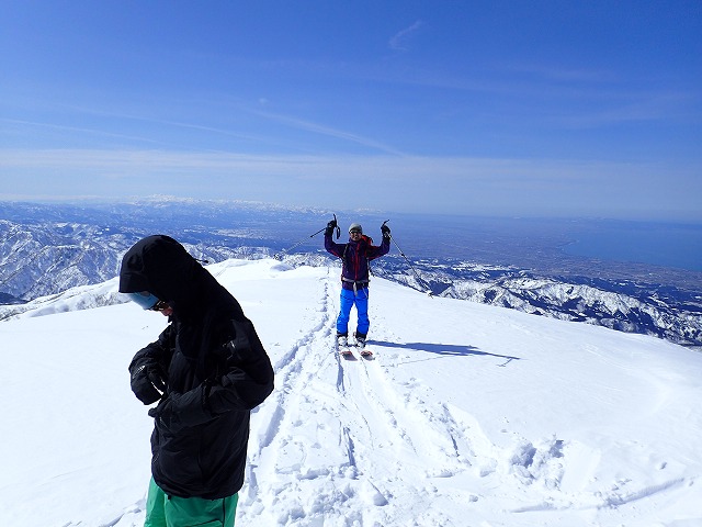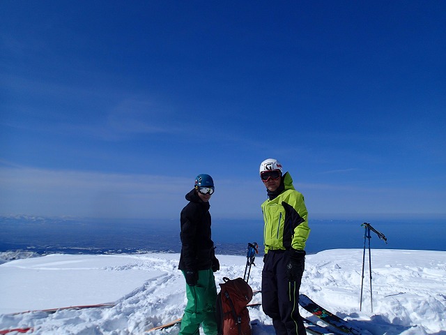 思わぬ再会の後、天狗蔵君が山頂へ。写真を撮り合いながら今日の素晴らしい天候に感謝しつつ滑降準備となります。