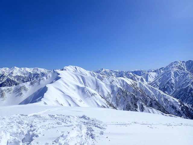 左側のトラバースが終わり、尾根に出ると、毛勝山や駒ヶ岳、北アルプスが目に飛び込んできます。