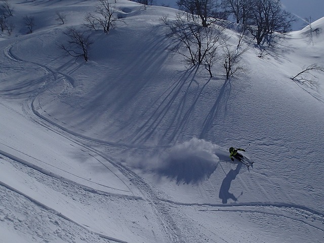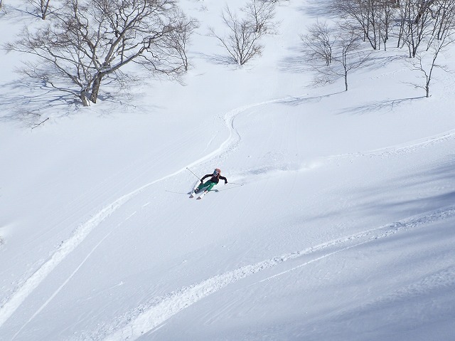 こんな状況の雪は、テールがロッカーになっている板が有効です。太くてもまったく問題がありません。