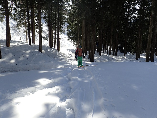 その後、絶妙なトレースに助けられ、登り返しの苦労をあまりしないまま、40分少々で尾根・杉林を抜け、林道に出ることができました。この林道への最後の下りが大変。一番体重のある私が最後に下ることになり、降りていくと、雪の斜面が崩れ、底が抜けてしまうのです。二人はその後を行くのが嫌だったらしく早々と降りてしまいました。