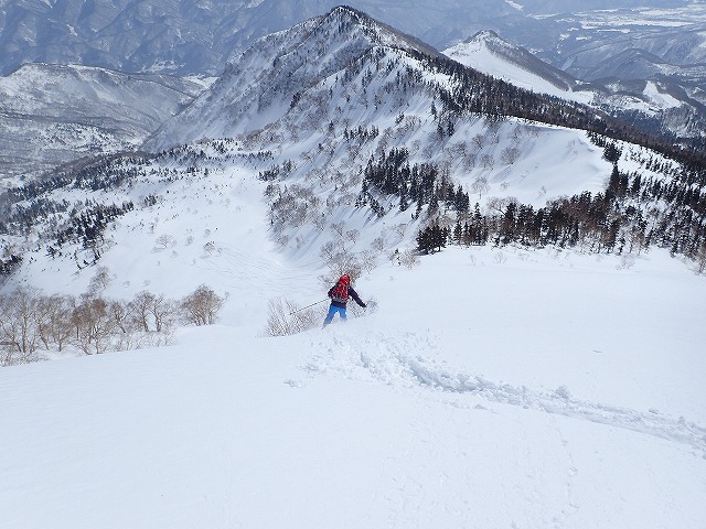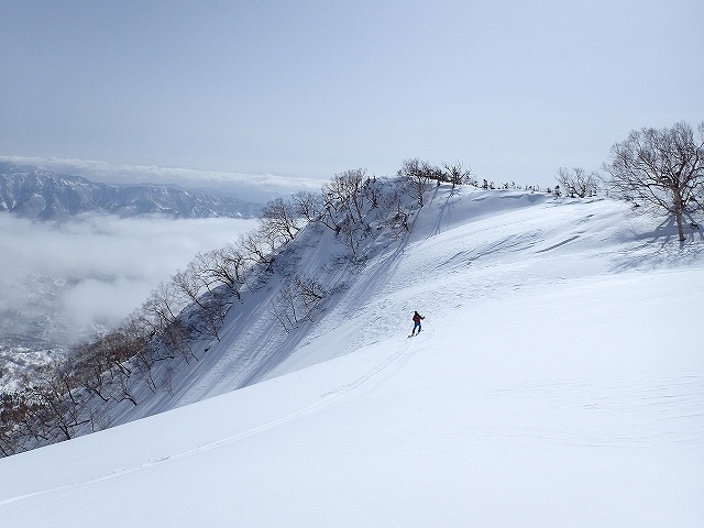 左・左と尾根を滑降していきますが、目の前に雪庇がでてきて、左に行こうとすると尾根が間違っていることに気づきました。正しい尾根に戻り滑降を続けます。順調に尾根を滑降。前回同様に二人だけのシュプールをゲレンデ上部に描くことができました。