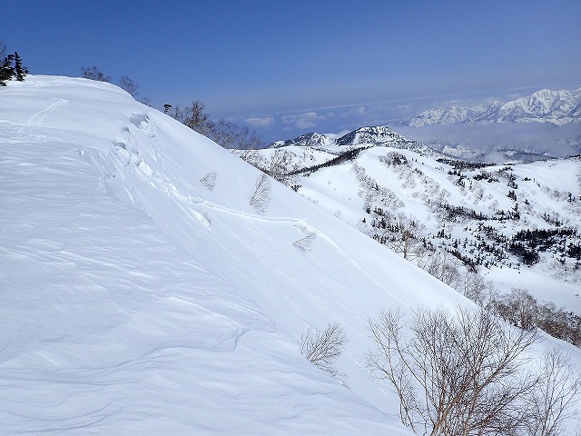 こんな時期でもパウダーが残っていそうな処をチョイス。先週の僧ヶ岳の疲れも少々残っているので、行き慣れた栂池高原の鵯尾根から裏鵯にダイブすることにします。いつもは、白馬乗鞍まで脚を伸ばすのですが、今回は鵯尾根で2ラウンドを実施。