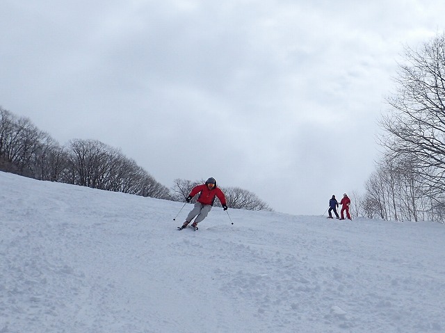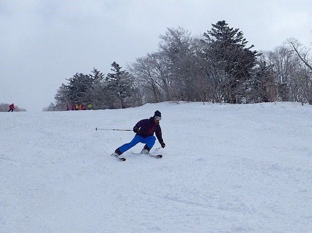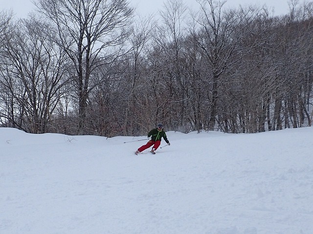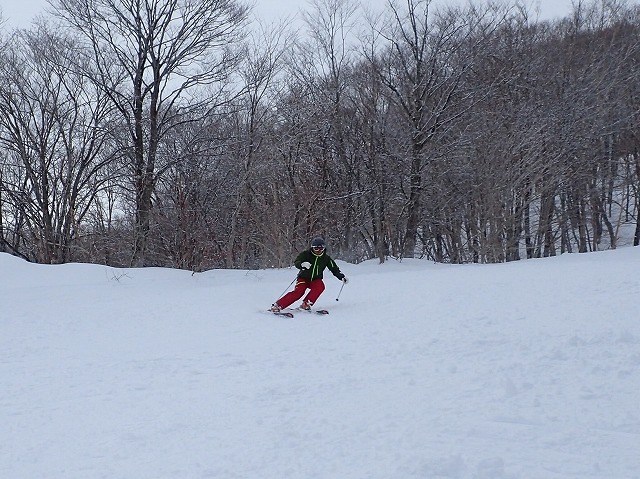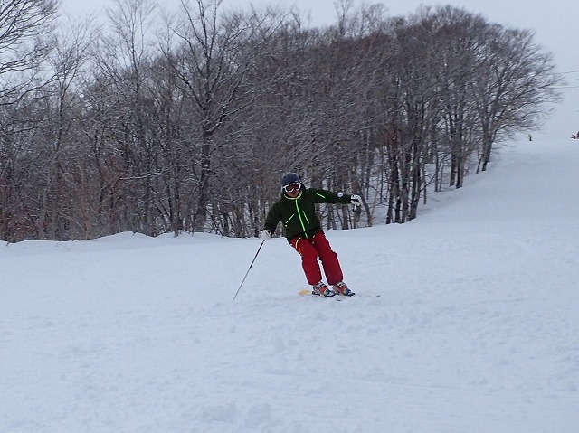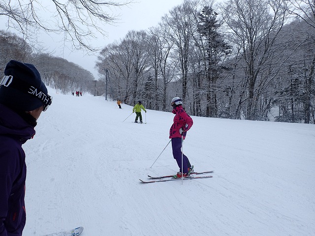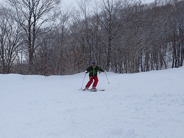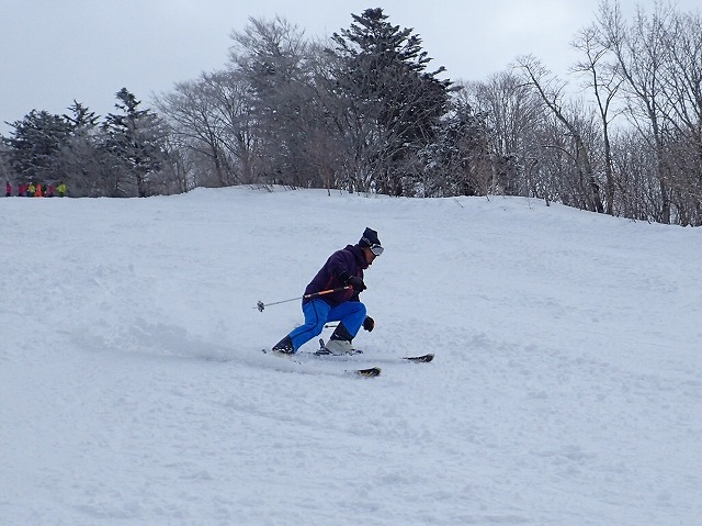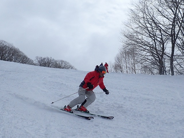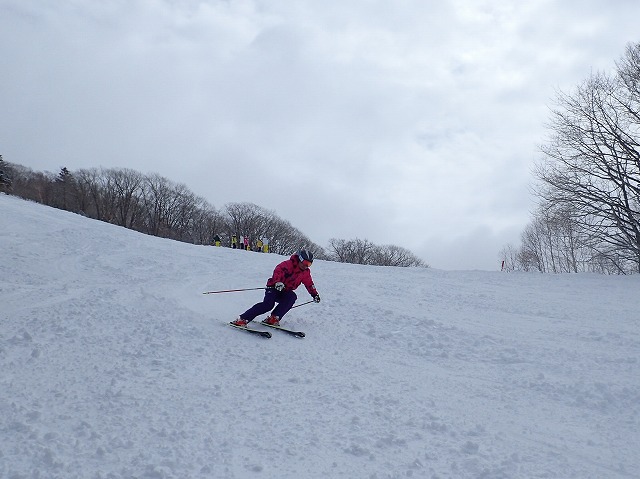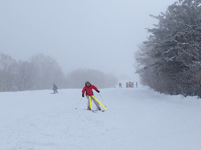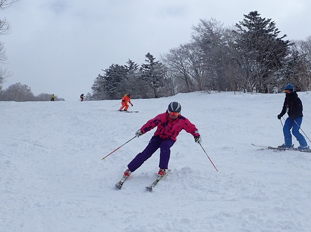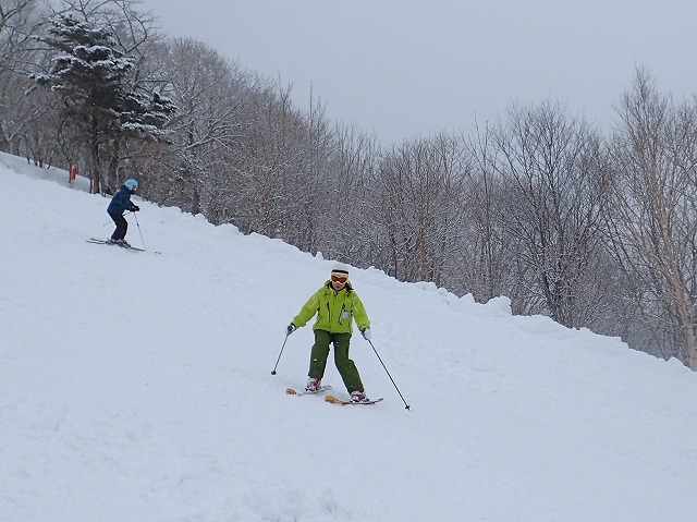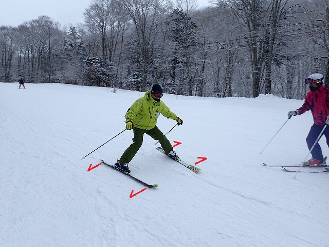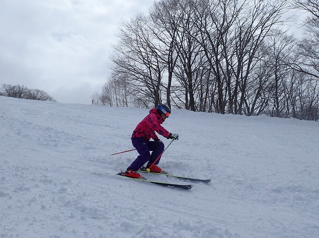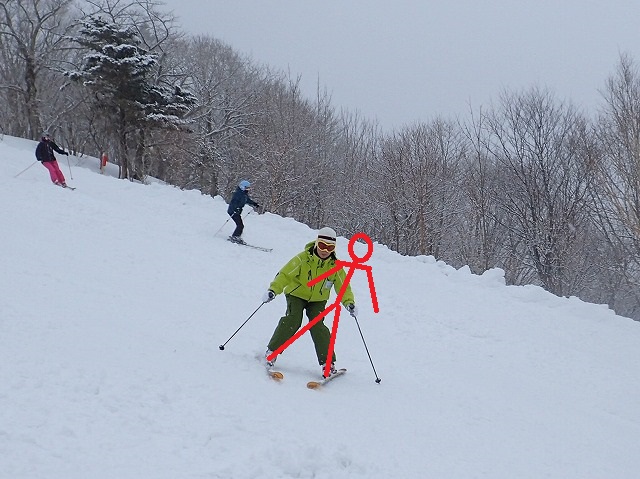 斜面の中で谷側に乗り、外スキーを押しずらします。久々に研修参加のディープママ。