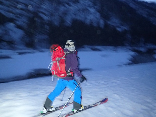 例年よりも雪が多いのにビックリ。倍はあるでしょうか。真っ暗の中を勝手知ったる林道をハイクしていきます。雪も固く締まっているため快調なハイクがつづきます。ただ今日はロング山行になるため、ペースを上げないようにします。
