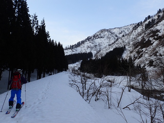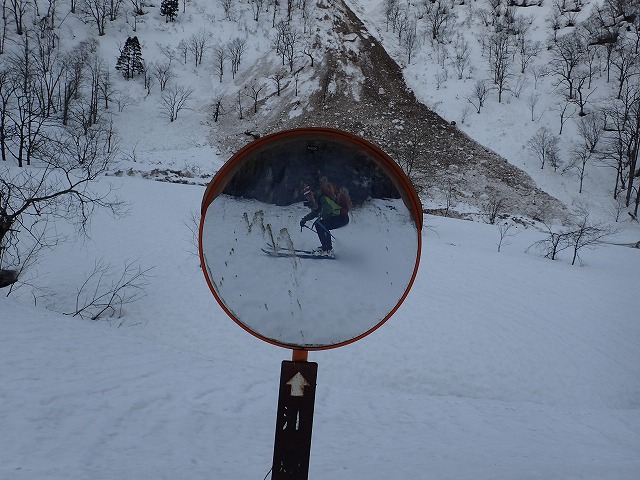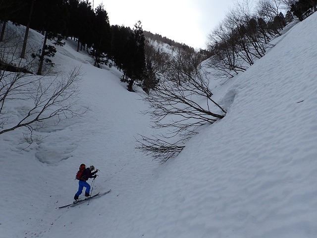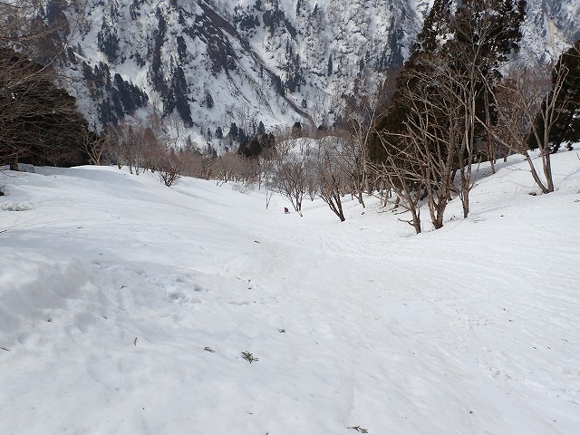 谷の中は、まだ雪が固く、クトーを付けないとシールのみでは滑ってしまします。