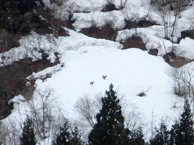 対岸の急斜面にカモシカは2匹。雪は崩れてもおかしくない角度。