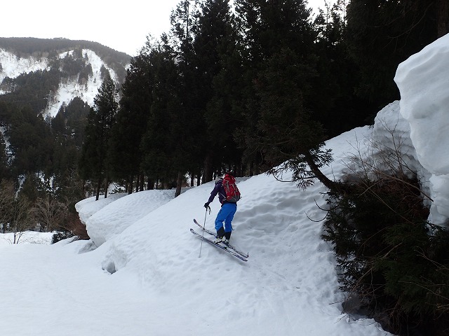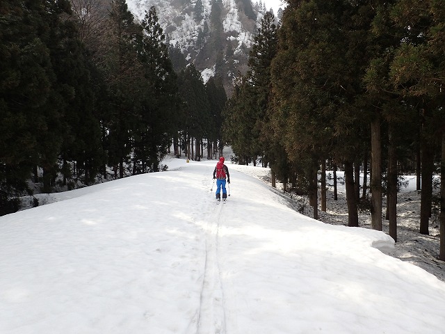 13:55 林道に戻ってきました。ここからは、手漕ぎで下るしかありません。自転車だとこがなくても下れるのですが、スキーはまったく滑ってくれないのです。林道にかぶさっているデブリをいくつもクリアー。南又分岐点に到着したころには相当疲れが出ていましたが、後は時間が解決してくれます。二人とも無言で手と足を動かします。前の人のトレース跡に入ると、楽ができるのです。私がたまに先頭を交代しますがほとんど天狗蔵君が前を行ってくれるので楽ができました。いつもながら感謝しかありません。