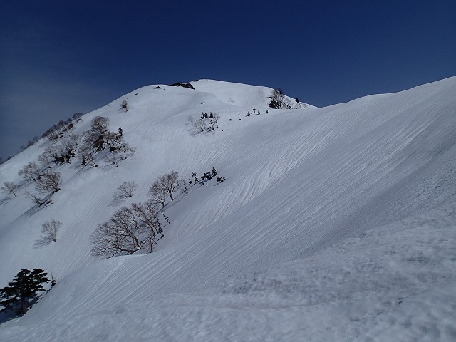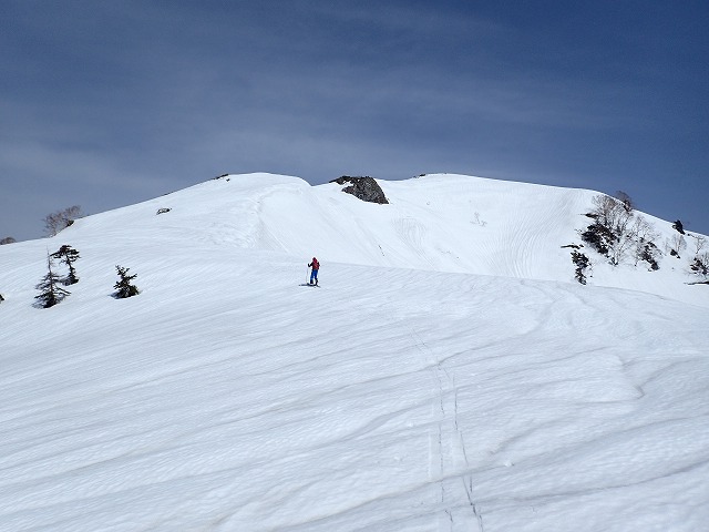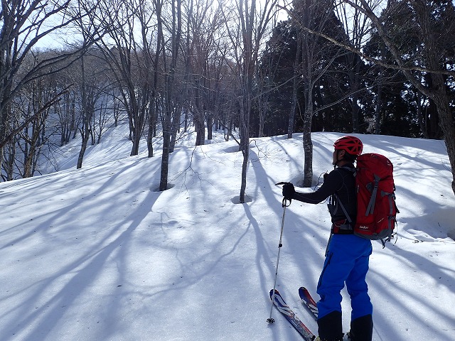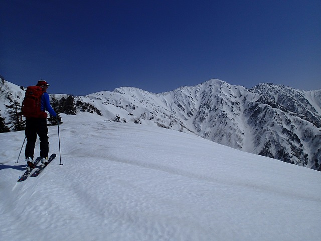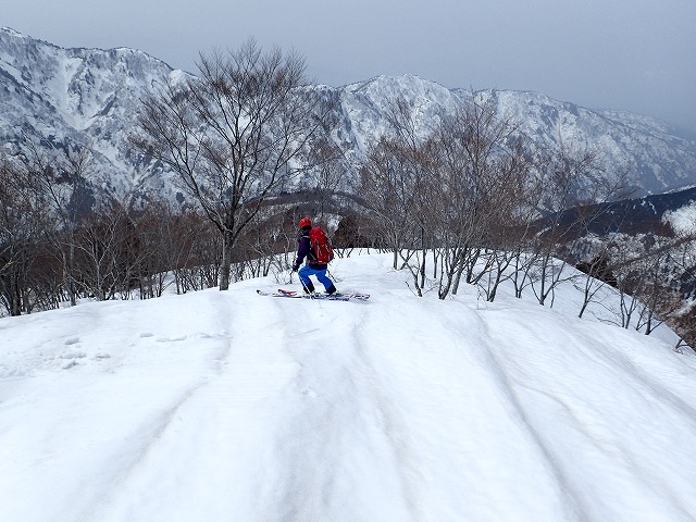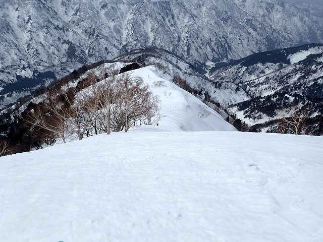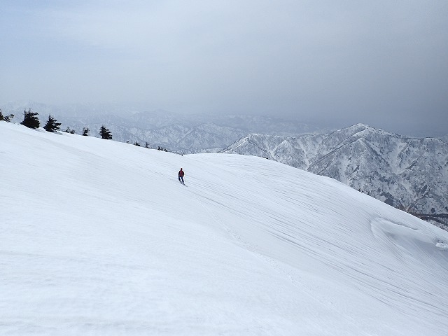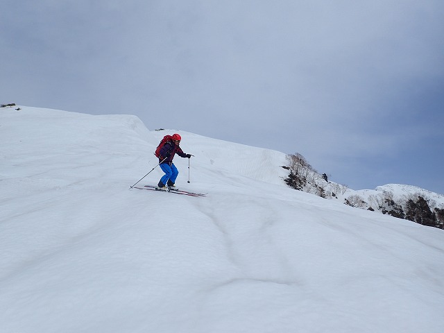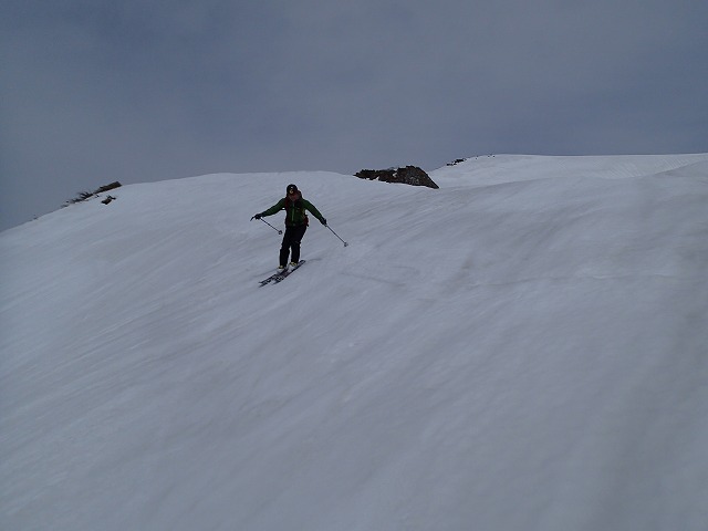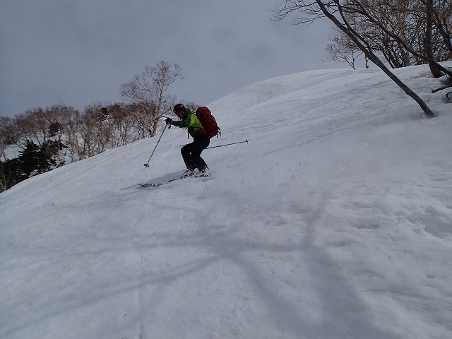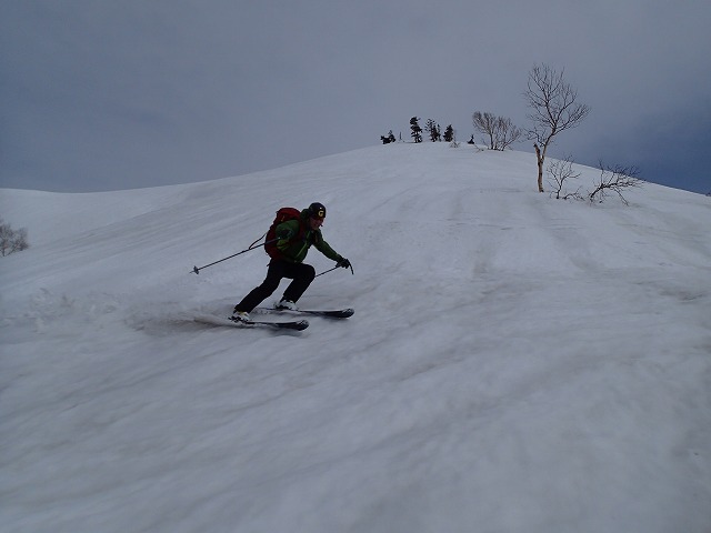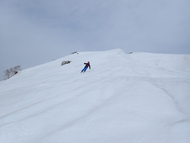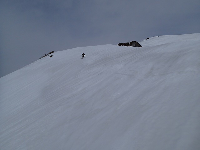 尾根を軽く滑降。雪面が波打っているのでスピードは出せません。