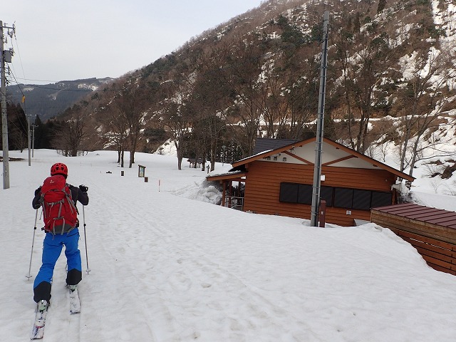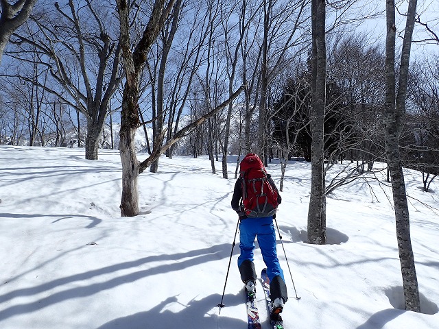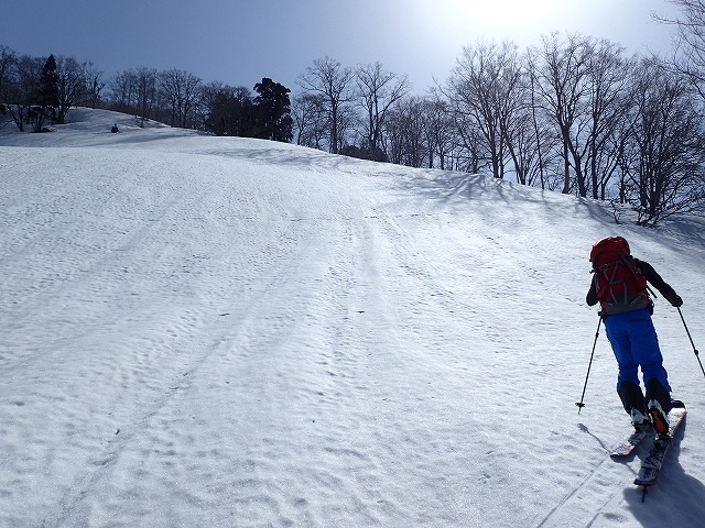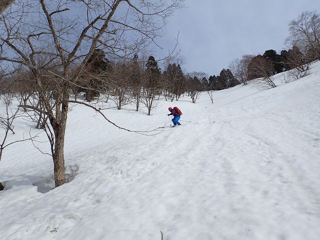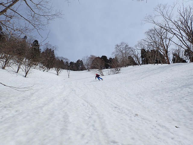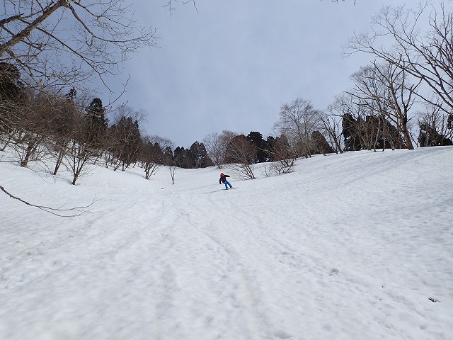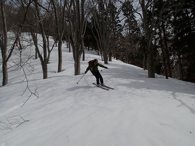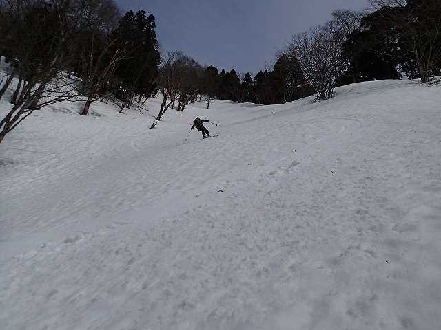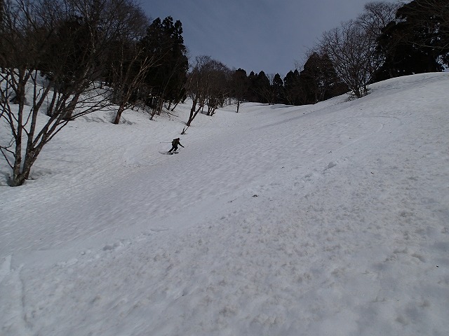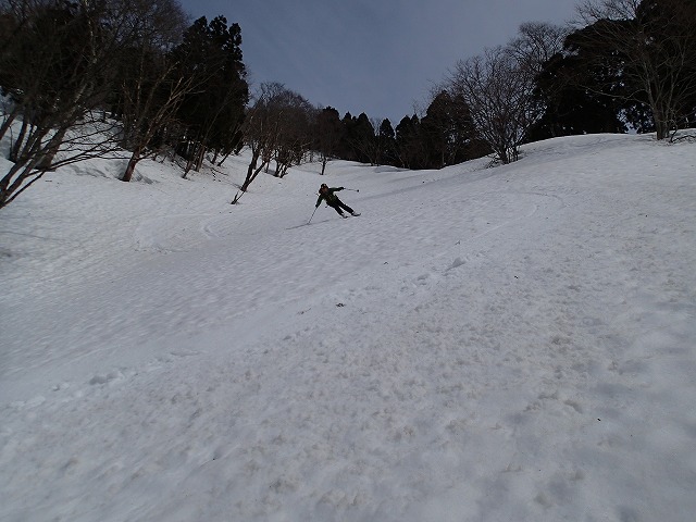 13:05 滑降を開始。山は2000mを超えていても一気に春山状態。雪面は固く縦溝(雪が解けて水が流れた跡)が入っています。快適な滑降とはいきません。