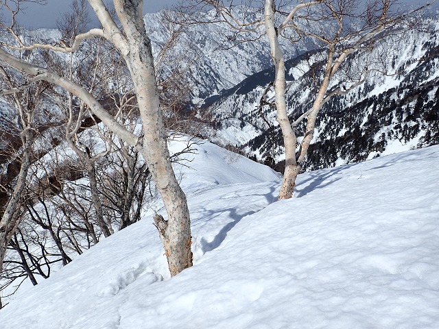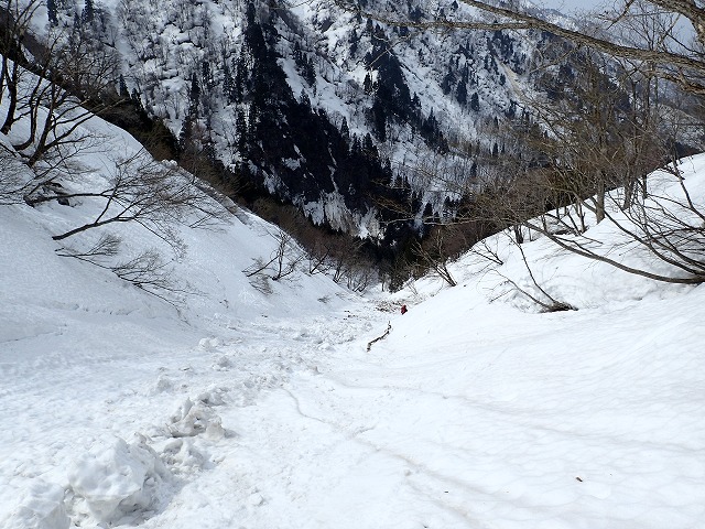 ビビりながらハイクした急斜面。左右はまっすぐ谷底へ。天狗蔵君は横滑りで慎重に下りました。