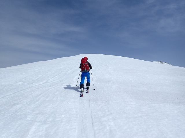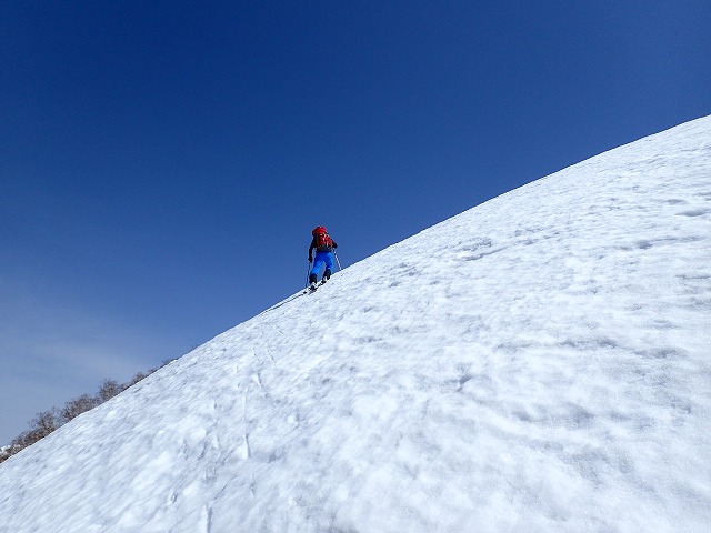 雪が固く斜度も急になってきます。デブリの跡もでており、スキーでの登行が難しくなってきました。スキーを外してツボ足でハイクすることにしましたが、今度は、表面の固い雪が崩れ、柔らかい雪では、足場ができずらくなって潜ってしまいます。