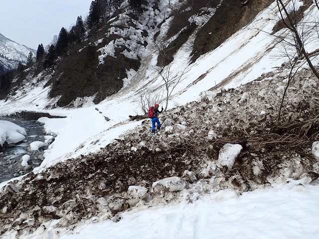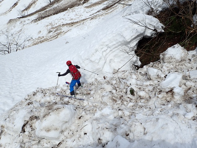 川をふさいでしまうほどのデブリを発見。今年は雪が多いので大きな底雪崩が至る所で発生しているようです。