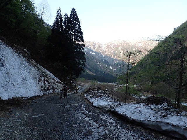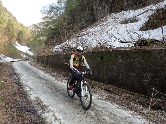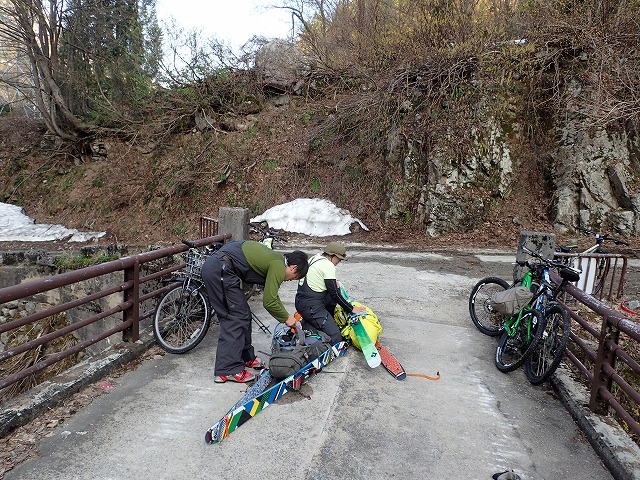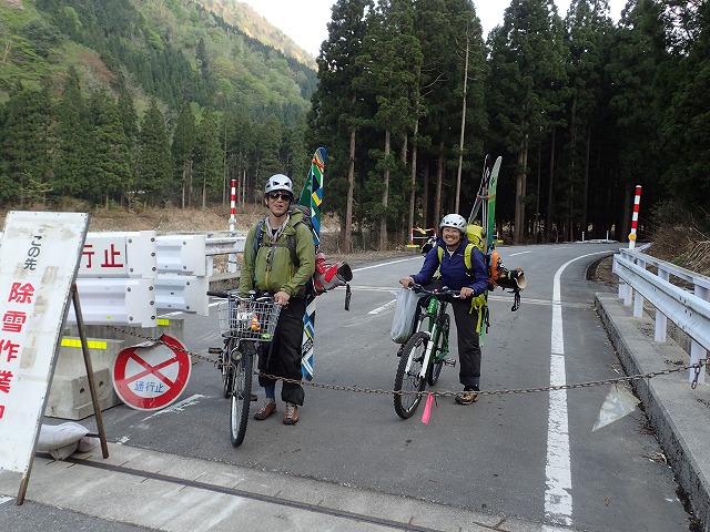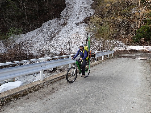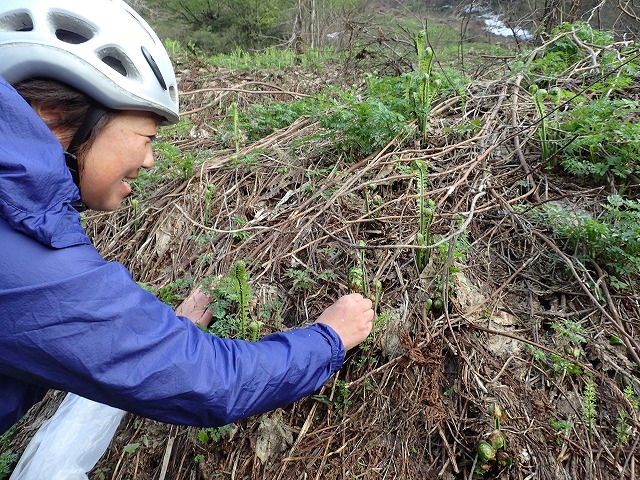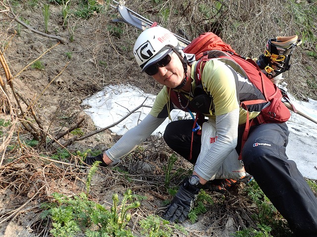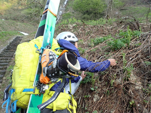 16:12桂の大木の前でスキーを外し、片貝山荘に。自転車を回収し、靴を履き替え帰りはるんるん気分で自転車に乗っているだけ。途中、雪の横の「蕗の薹」「タラの芽」「コゴミぜんまい」を採りながら下って行きます。第四発電所の近辺に沢山の山菜があり、時間を忘れて山菜採りに夢中になってしまいました。残雪期の第2のお楽しみです。