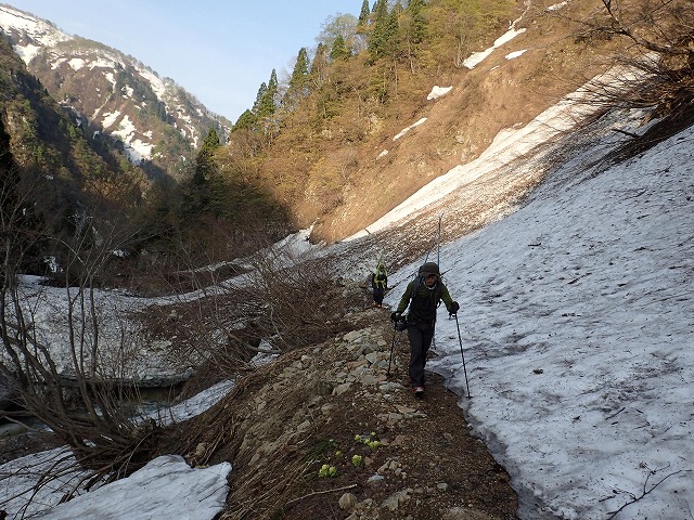セメントの橋を通過し、トラバースしながら進みます。前回も落雪のあった場所でジグを切ってハイク通に私たちに横を直径50cmほどの雪のかたまりが転がっていきます。まったく音もなく転がってくるので、いつも斜面の上を見ながら進むしかありません。肝を冷やした瞬間でした。