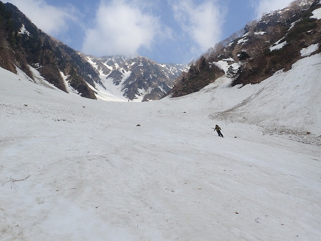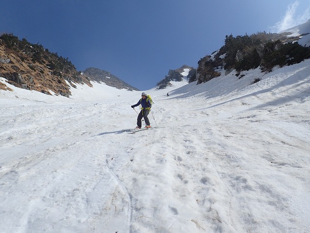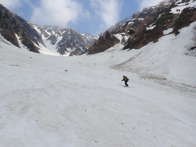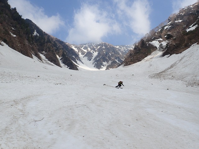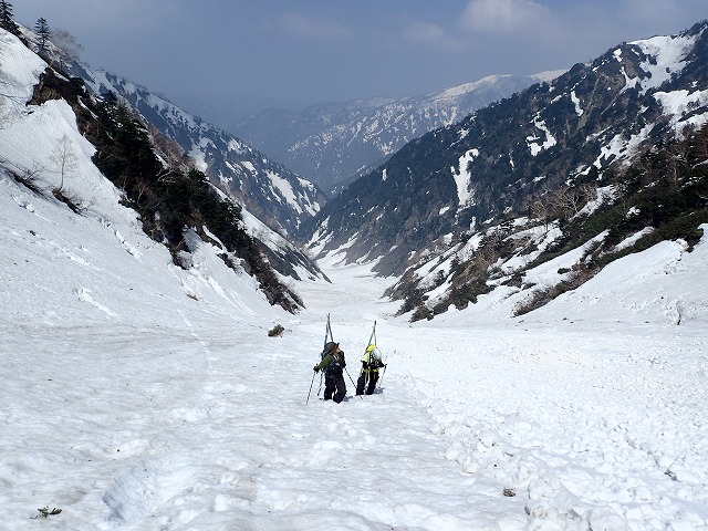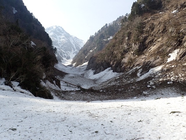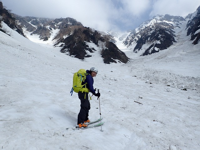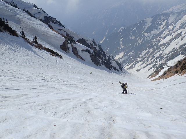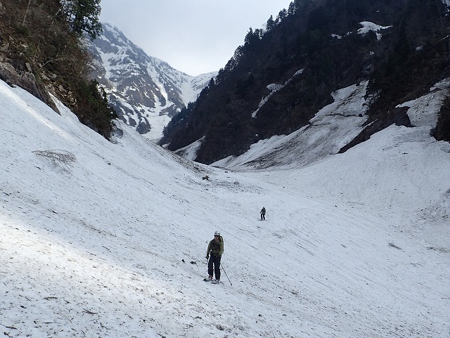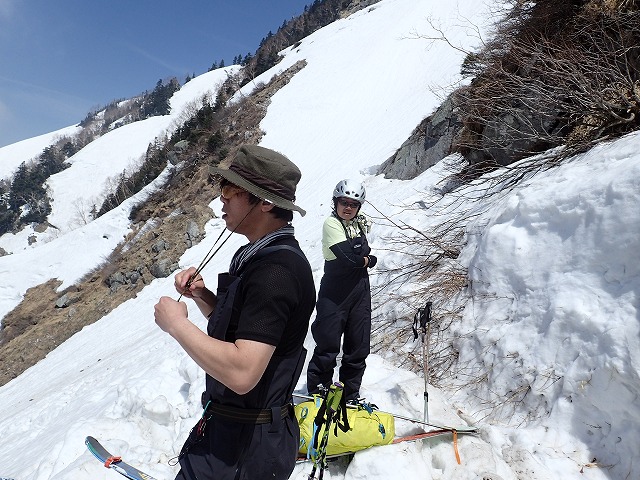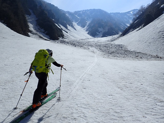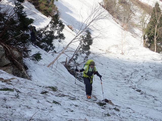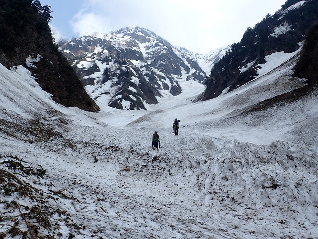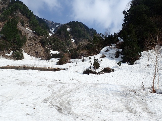 8:11最終堰堤を通過し、いよいよ本格的な登りとなります。大明神沢の出合いまでは、両側から落石や雪崩の跡が残っており、今までにない荒れた状態でした。そんな中を苦労しながら進みます。どろどろの雪崩の跡を見て、「帰りはここ滑るんですか。」質問してくるクスミン。思わず「もちろん」と答えてしまいました。それは私でも無理です。