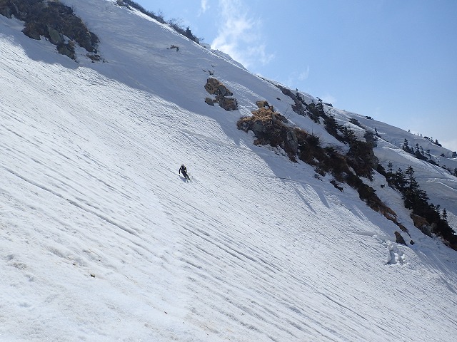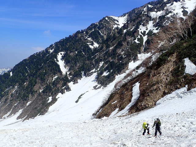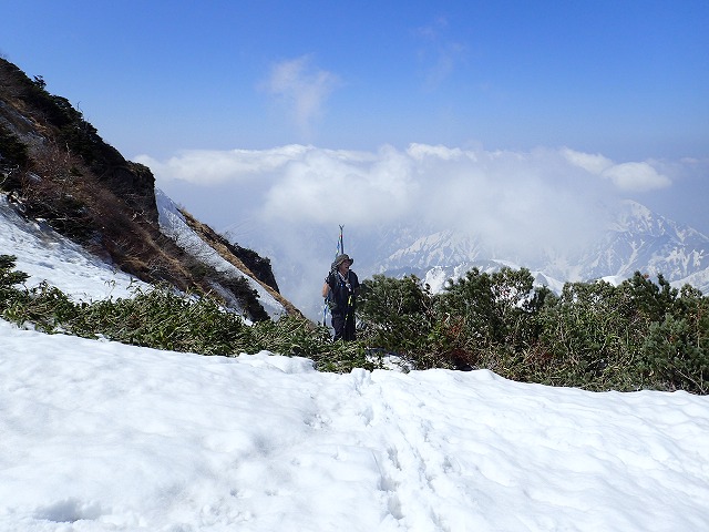 9:00に大明神沢出合いを通過します。今日も相当気温が上昇しそうです。気温の上昇は雪面の緩みになり、スキーを脱いだ後のハイクに影響してくるのです。傾斜がきつくなると二人のペースがやはり落ち始めました。斜面も荒れた状態です。スキーでのハイクが少しずつ困難になっていることを確認し、アイゼンでの登行に変更しました。