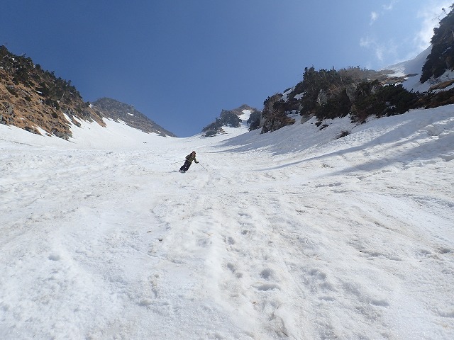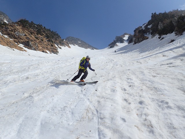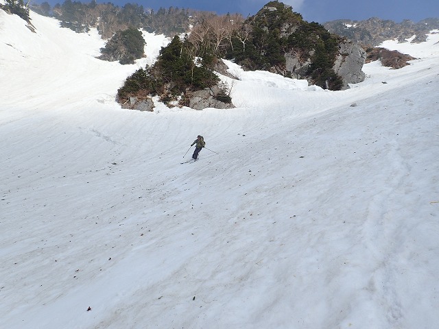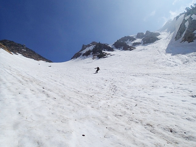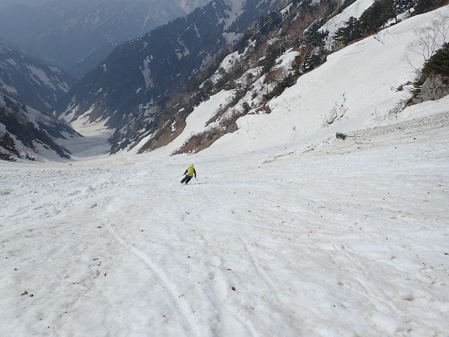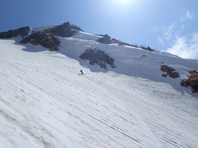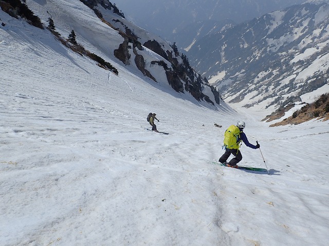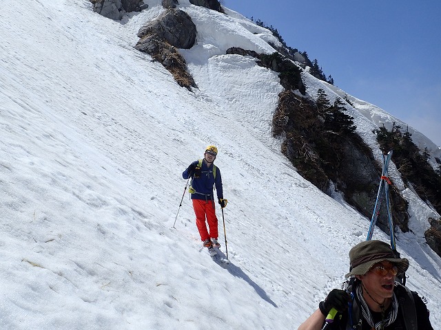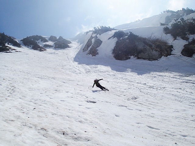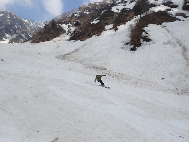 3人で写真を撮りあい、高度を下げていきます。デブリの状態の悪いところの通過に、クスミンンは苦労しているよう。思わぬ転倒場面もありました。このデブリの中を安全にクリアーできることも残雪期のスキー技術の一つなのです。
