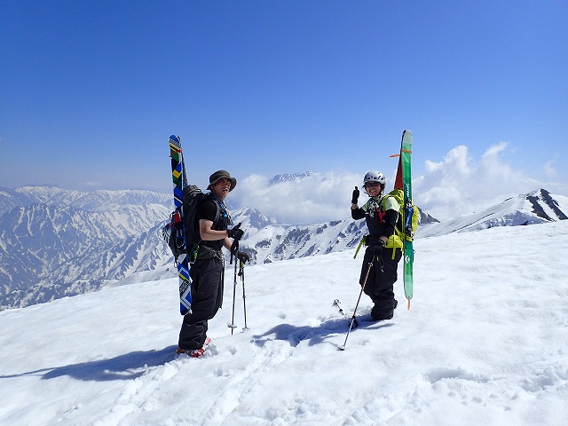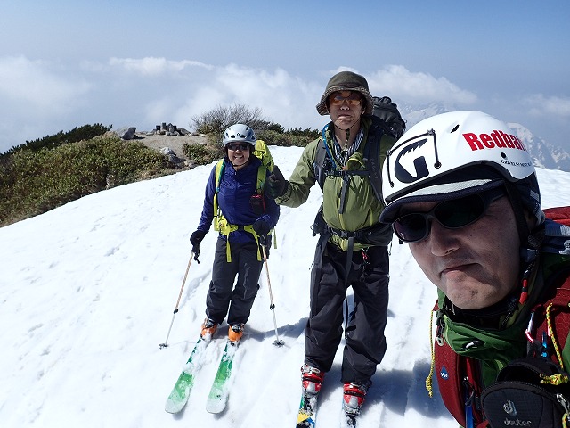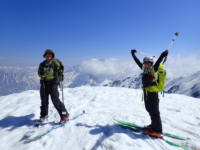 二人の感動の言葉が鞍部に響きます。残念なことに剣岳の全容は見えませんでしたが、後立山連峰の山々はしっかり見ることができました。ここから山頂までも結構あるのです。スキーを装着して山頂を目指します。キザノ君の脚はもう限界にきているようですが、リュックを背負って最後まで山頂を目指してもらいました。彼も最後の試練を乗り越えることができ、山頂に