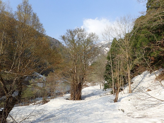 6:33スキー靴に履き替え、安部木谷入り口の橋を目指します。ここからの雪の量は、いつもの倍以上はありそうです。私の好きな「桂の大木・トロロの樹」の前でスキーを装着。最終堰堤を目指します。