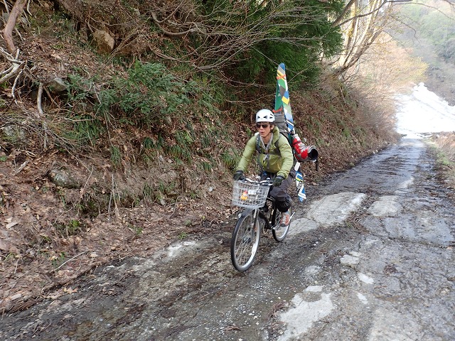 16:25片貝山荘に戻ってきました。スキー靴を抜いてシューズに履き替えます。自転車で下るのみ。