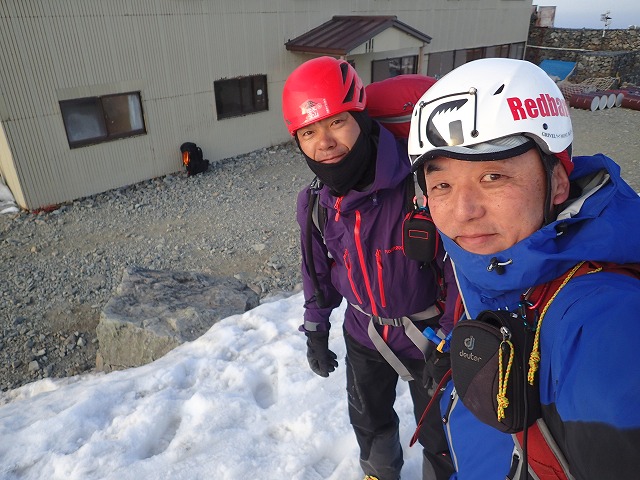 7:51池の平小屋に到着です。もちろん小屋は屋根の一部が出ているのみ。掘り起しには時間がかかるようです。ここでマッタリと時間を過ごします。エネルギー補給、ハイドレーション内に雪を入れ水分確保。(天狗蔵君は(-。-)y-゜゜゜)