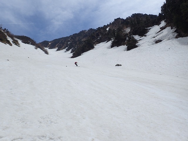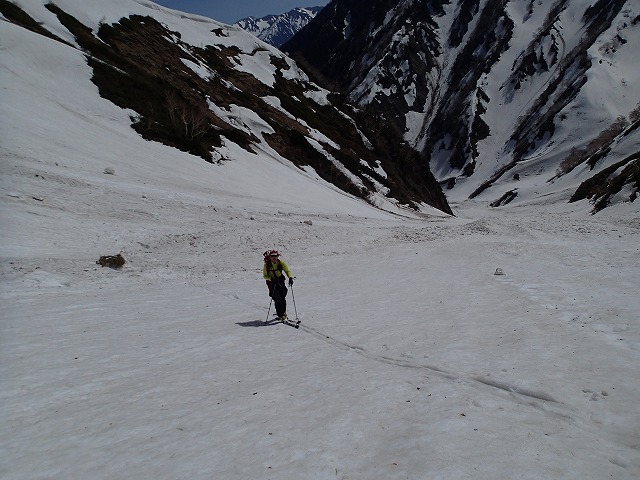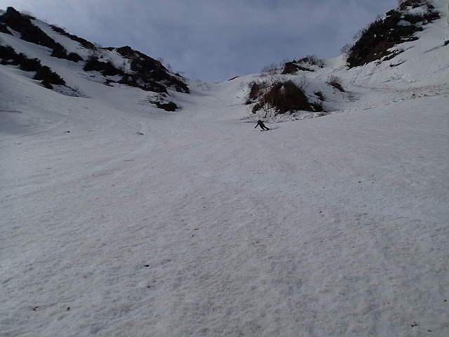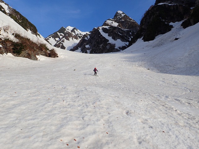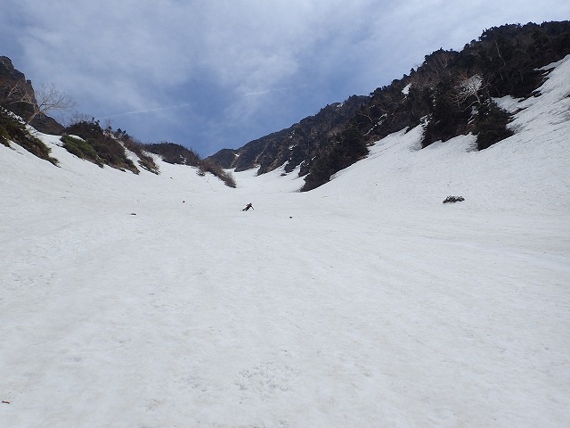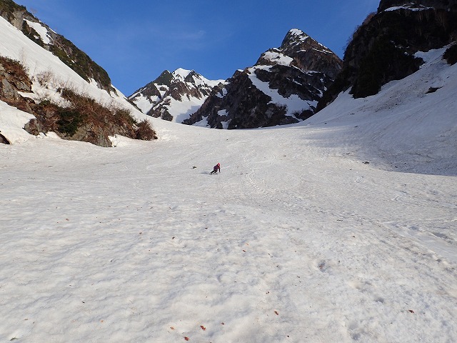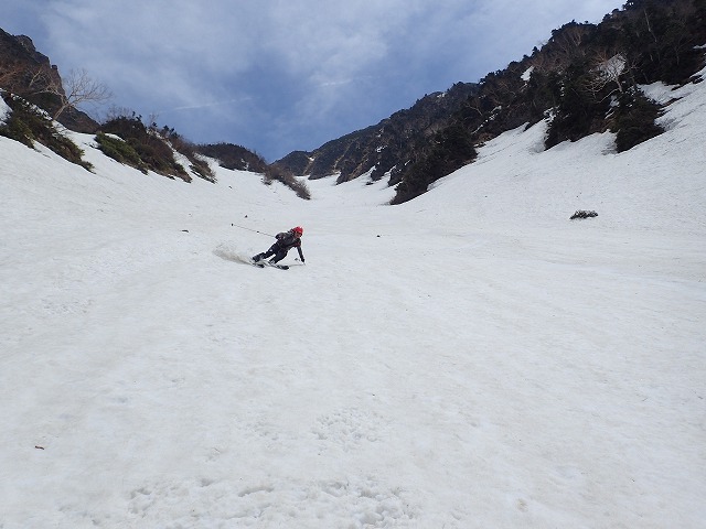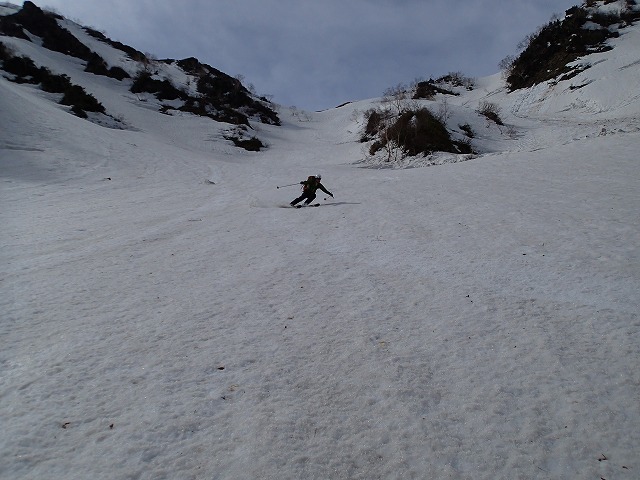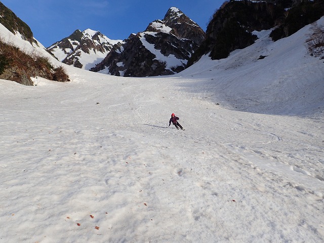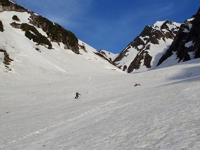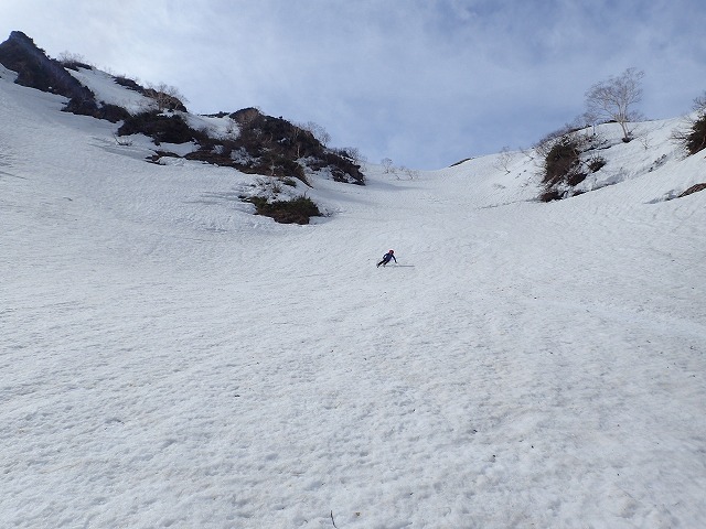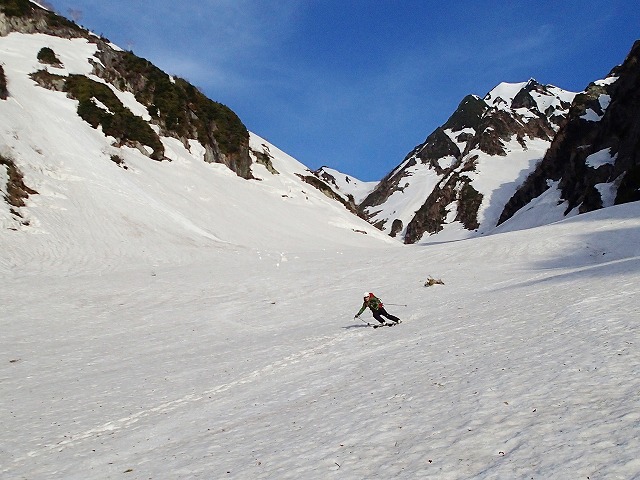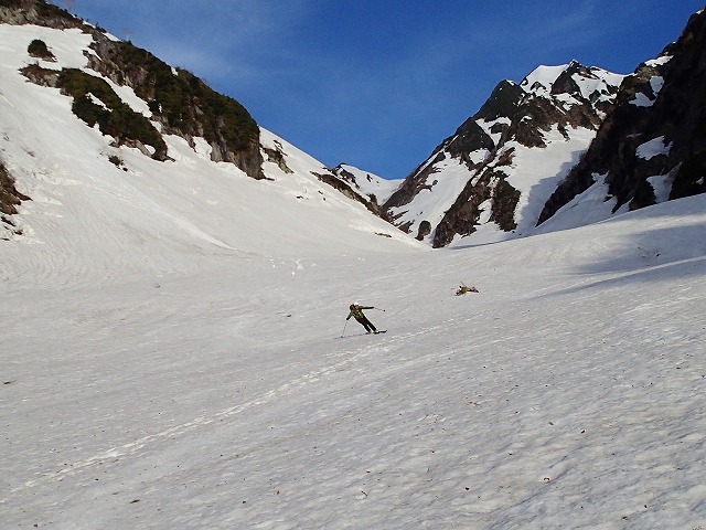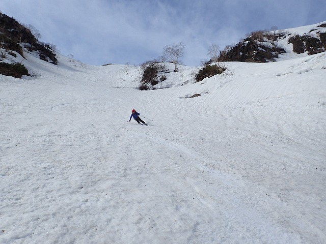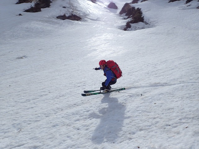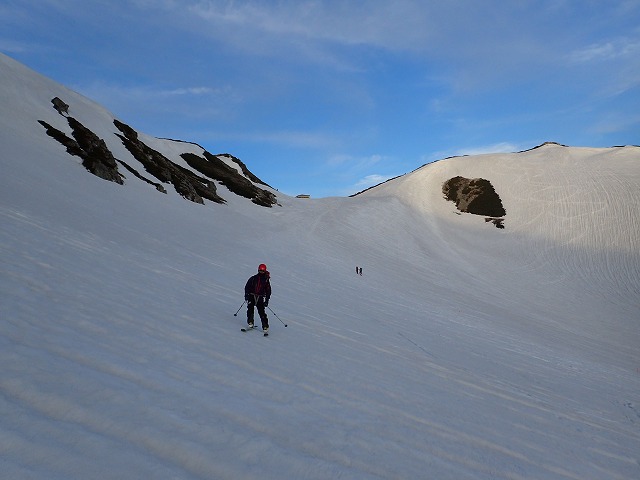 11:08大窓滑降を開始。縦溝も少なく前半は、谷に向かて左側を滑降。快調でしたが、雪が繋がっていないことが判明。尾根を乗り越え右側の雪渓に移動する羽目に。ここは落石も多く地雷もたくさん隠れています。ですが、スキーでの滑降はあっという間。