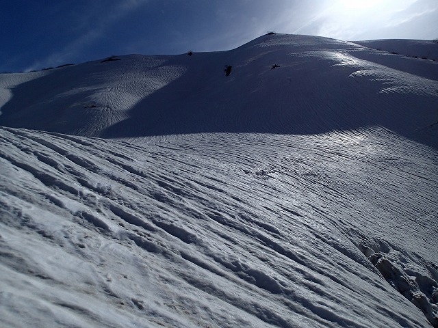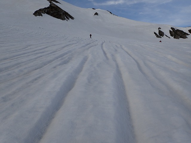 カチカチの縦溝地獄。ここを滑降できれば山スキーもOKでしょう。一緒にスタートしたボーダーは、降りてこれません。
