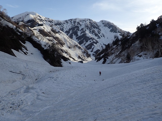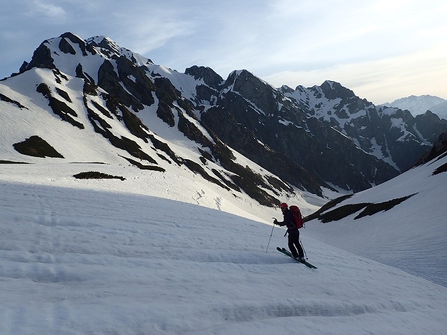 6:53 北股を進みます。白い山が「池平山」です。この角度から見ると穏やかな顔を見せていますが。この山を滑っている跡もありました。