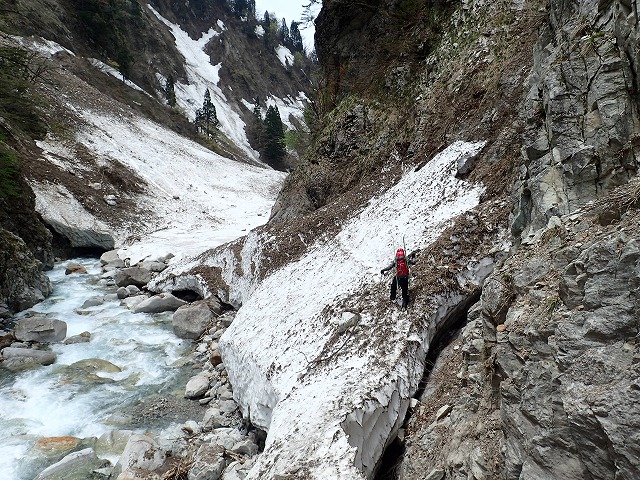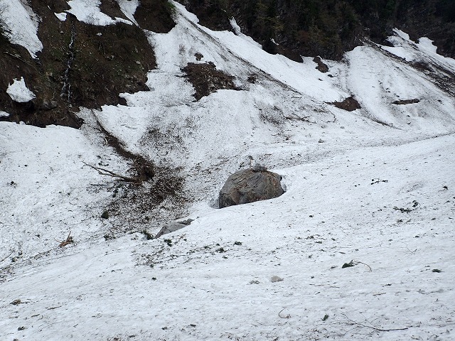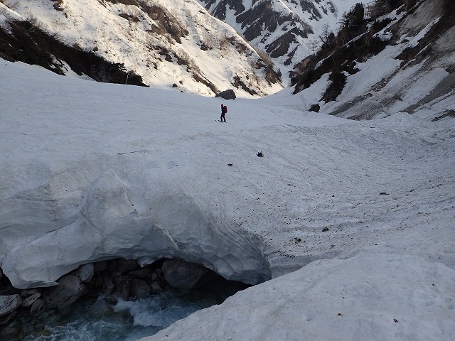 11:33西仙人滝を通過。滝も雪にうまっています。どこに滝があったのかわからないほどでした。11:44雷岩を通過。この間を10分でクリアーです。ここまではほとんど雪に覆われ、何の問題もなく滑降することができました。問題は、「鷹の座り」です。11:57ここも雪が繋がっており、アイゼンを装着して無事にクリアー。その後は雪面をアイゼンのまま下ります。取水口で右に行こうか、左に行こうか迷ていたのですが、下から登山者が2名上がってきます。彼らは左側からの来るので、そちらを選択。ただ、左側だと必ず渡渉しなければなりません。二人から渡渉場所について情報をもらい、覚悟を決め行くことに。