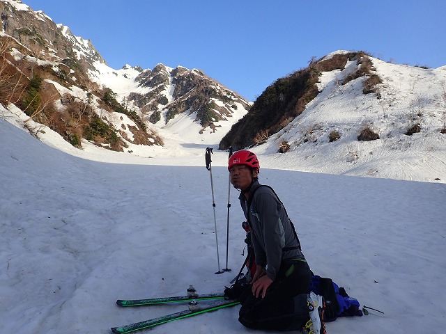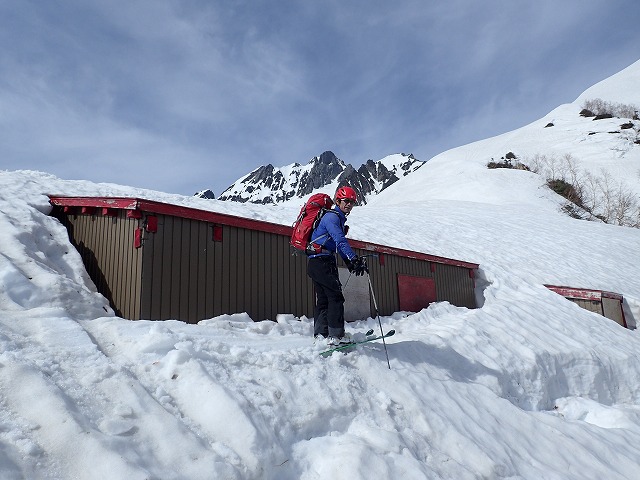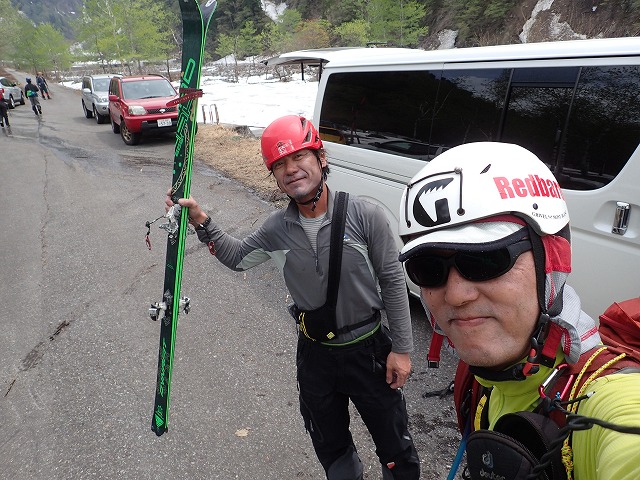 13:03馬場島の車に到着です。二日間にわたる残雪期の山行は初めてでした。すべてが予定通りだったと思います。二日目は意外と余裕がありましたが、なんといっても大窓の雪庇乗り越えが一番スリルがあったようです。雪面は、縦溝に悩まされたところもありましたが、気持ちの良い滑降を楽しめた場所も多く、剣岳という素晴らしい山の周囲を、スキーを活用して一周することの楽しさと充実感は、これまで経験してきた山スキーの中ても一番となりました。