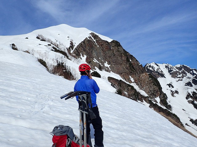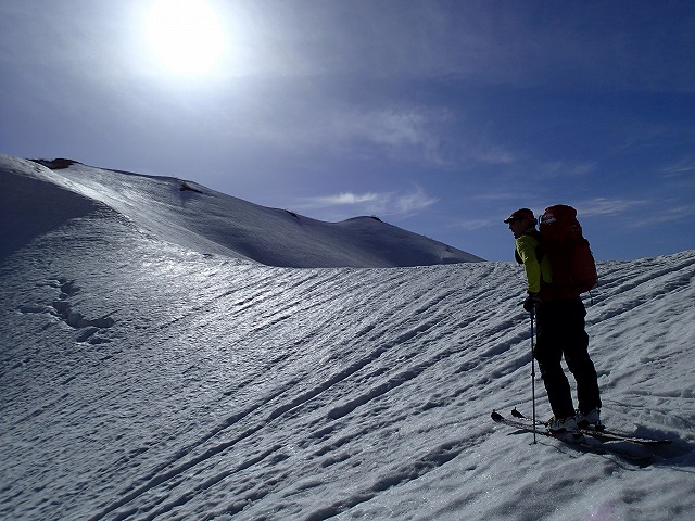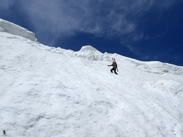8:51ハイク開始。標高2020m地点までは約1時間でクリアー。いいペースです。ただここから暑さとの戦いが始まります。気温が急激に上昇。ジグを切るごとにハイドレーションをくわえてしまいます。雪庇の約5メートル手前までどうにかスキーで登りあげましたが、ここからが問題です。アイゼンを付け、スキーをリュックに括り付けます。天狗蔵君が左側からトライしてみましたが、雪庇が邪魔になり、クリアーを断念。私が立っていた中央付近のほうが行きやすいとの指示が届きます。アイゼンを雪面に蹴りこみ、ストックのピックを雪面にくいこませての慎重なハイクとなりました。どうにか雪庇をクリアー。上に出てみると雪庇全体が傾いた形になっています。なので例年とは違った状態だったようです。