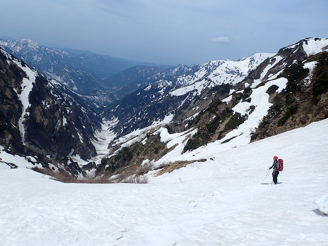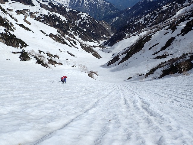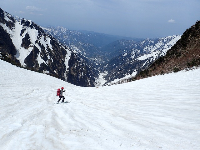 ここから大窓の出合まで小黒部谷を滑降していきます。目の前には縦溝の無い素晴らしい斜面が広がります。