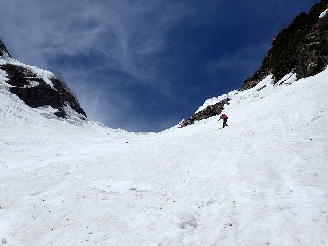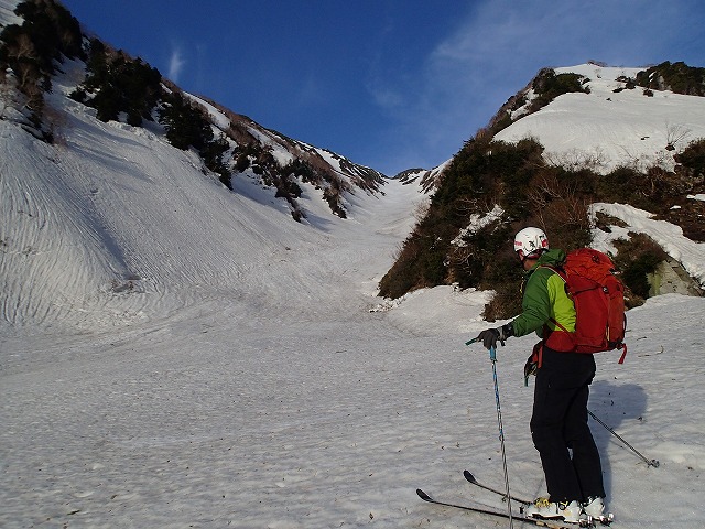 8:24滑降。予想通りです。適度に緩んだ雪面をカービングで攻めていきます。あっという間に大窓の出合についてしまいました。ここから大窓へ登り上げるのです。標高1525m~2206m 標高差約700mですが長く感じます。この大窓の一番の難所は最後の登り上げにあります。毎年大きな雪庇が形成され、年によって右端から上がったり左端から上がったりといろいろな情報があります。今回もここで苦労させられることに。