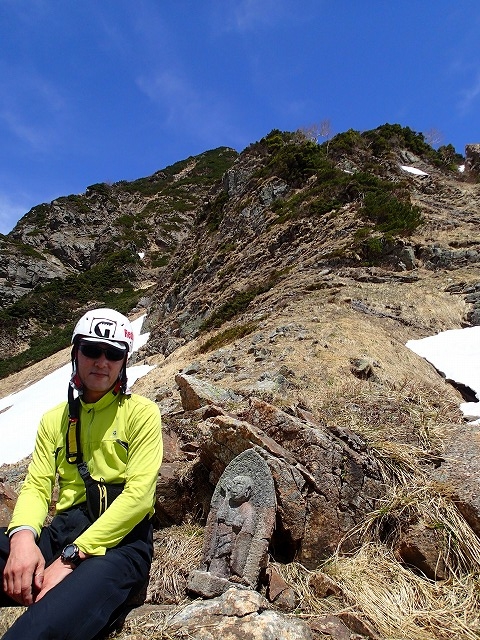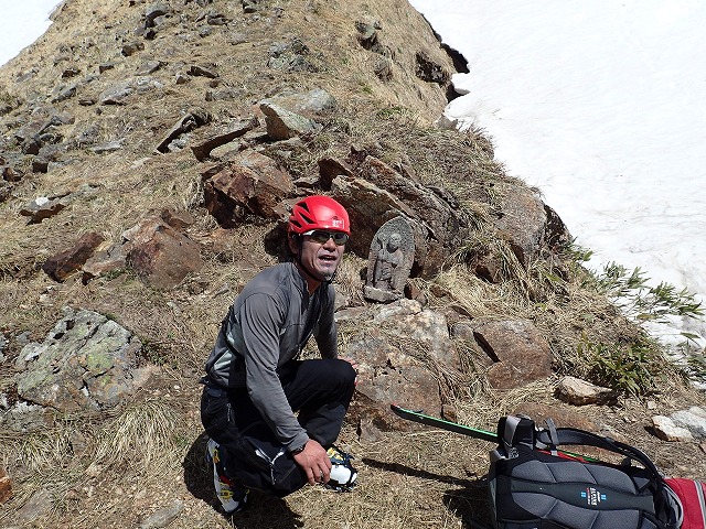 10:42鞍部に到着。お地蔵さんに感謝し、マッタリした時間を過ごします。目の前に登山者が「大窓の頭」めがけてトライ中です。ただ、どう見てもルートが違っているのです。私たちが行ったときは右側のハイマツ地帯をハイクしたことを覚えています。パーティー5人はわざわざ左側からザイルを出してハイクしています。(まあ仕方ありません。)