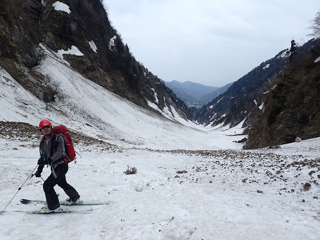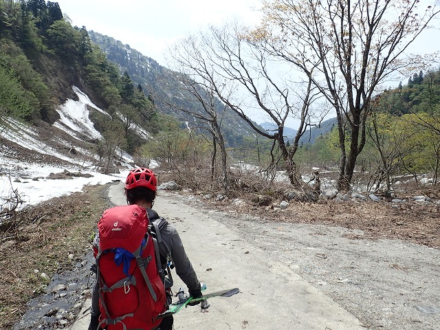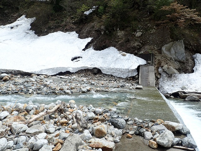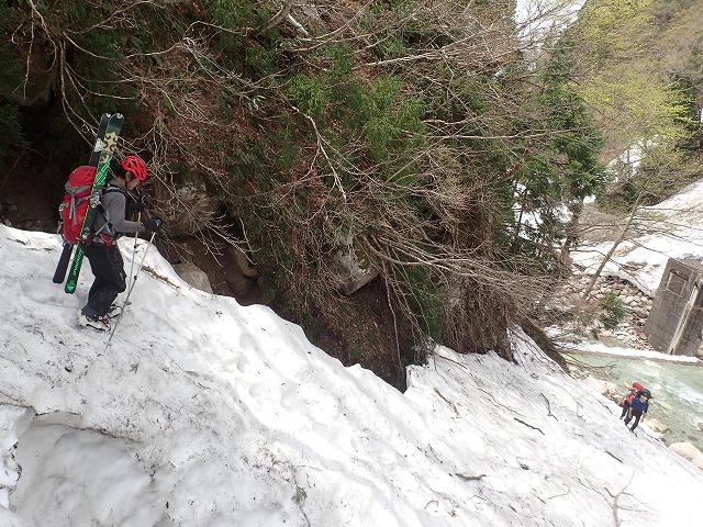 少し進むと、広い堰堤がでてきます。堰堤の上はセメントで平になっており、スキー靴の半分は水につかりそうですが、素早くいけそうと判断しました。最初に私が走って渡渉。少々水も入ってきましたが、気になるほどではありません。