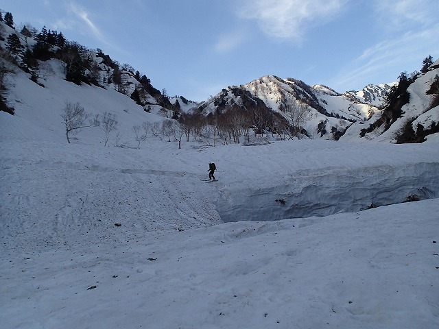 6:27エネルギー補給を済ませ、今日の1回目のハイクスタートです。三の窓を横目に見ながら、北股へ入ります。傾斜もゆるく快調にハイク。7:13小窓雪渓から別れ、池の平小屋への斜面に入っていきます。登り上げたところに「平の池」があるのですが、もちろん雪の下。ここに来ると池の平山からの滑降跡も残っています。素晴らしい斜面が目の前にあり、思わず行ってみたくなります。