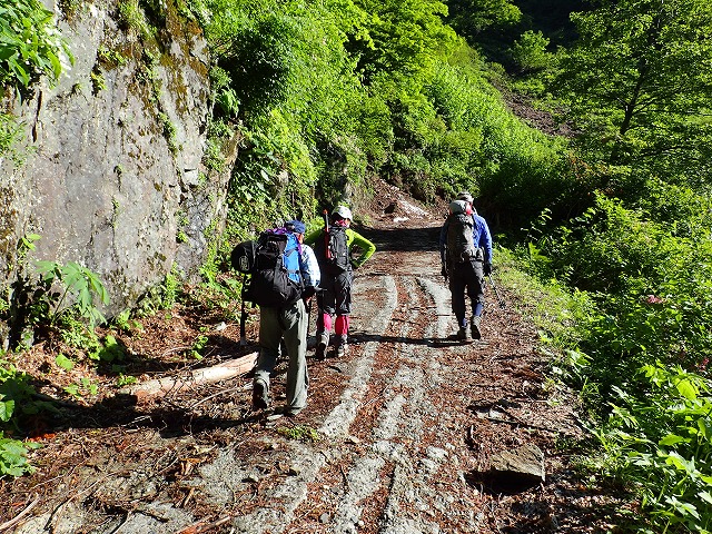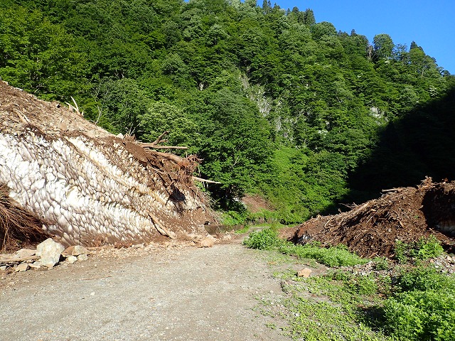 例年、片貝山荘上の登山口まで車は入るのですが、今年は雪が多いせいか、第三発電所・南又との分岐点が最終車止めとなっています。ここから登山口までは1時間の行程となるので、やはり自転車持参がよかったかもしれません。